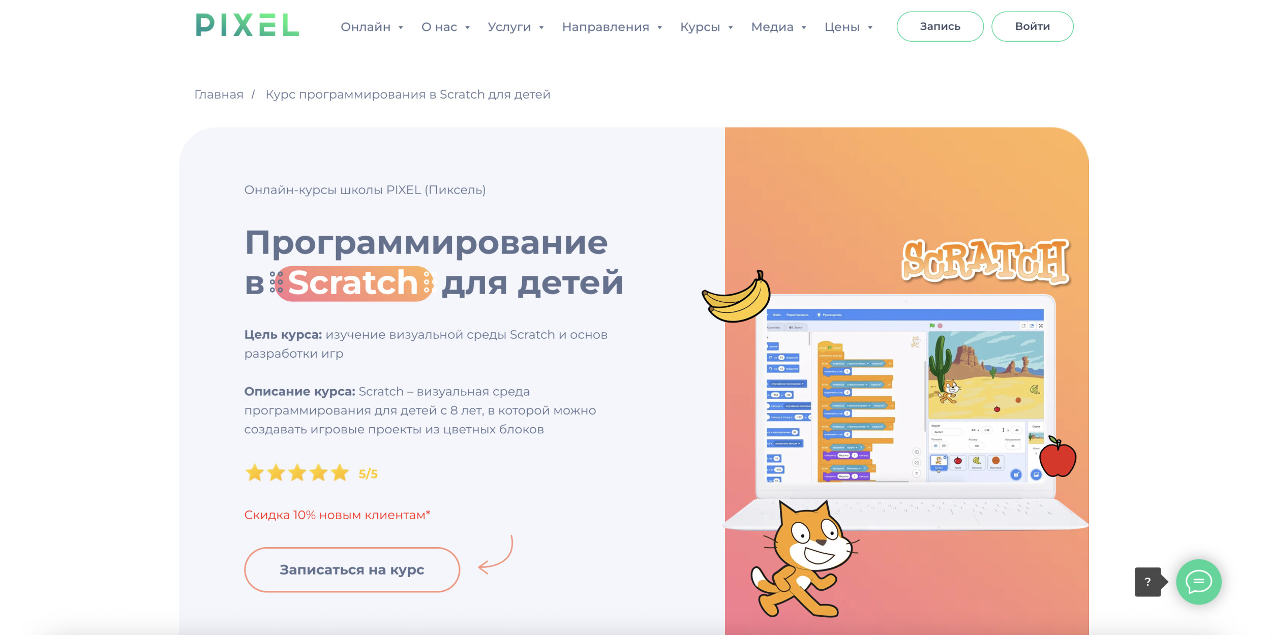 Pixel — онлайн-школа программирования для детей и подростков, где обучение строится на практических проектах. В рамках курса Scratch ученики знакомятся с визуальным программированием и постепенно создают собственные игры и анимации.