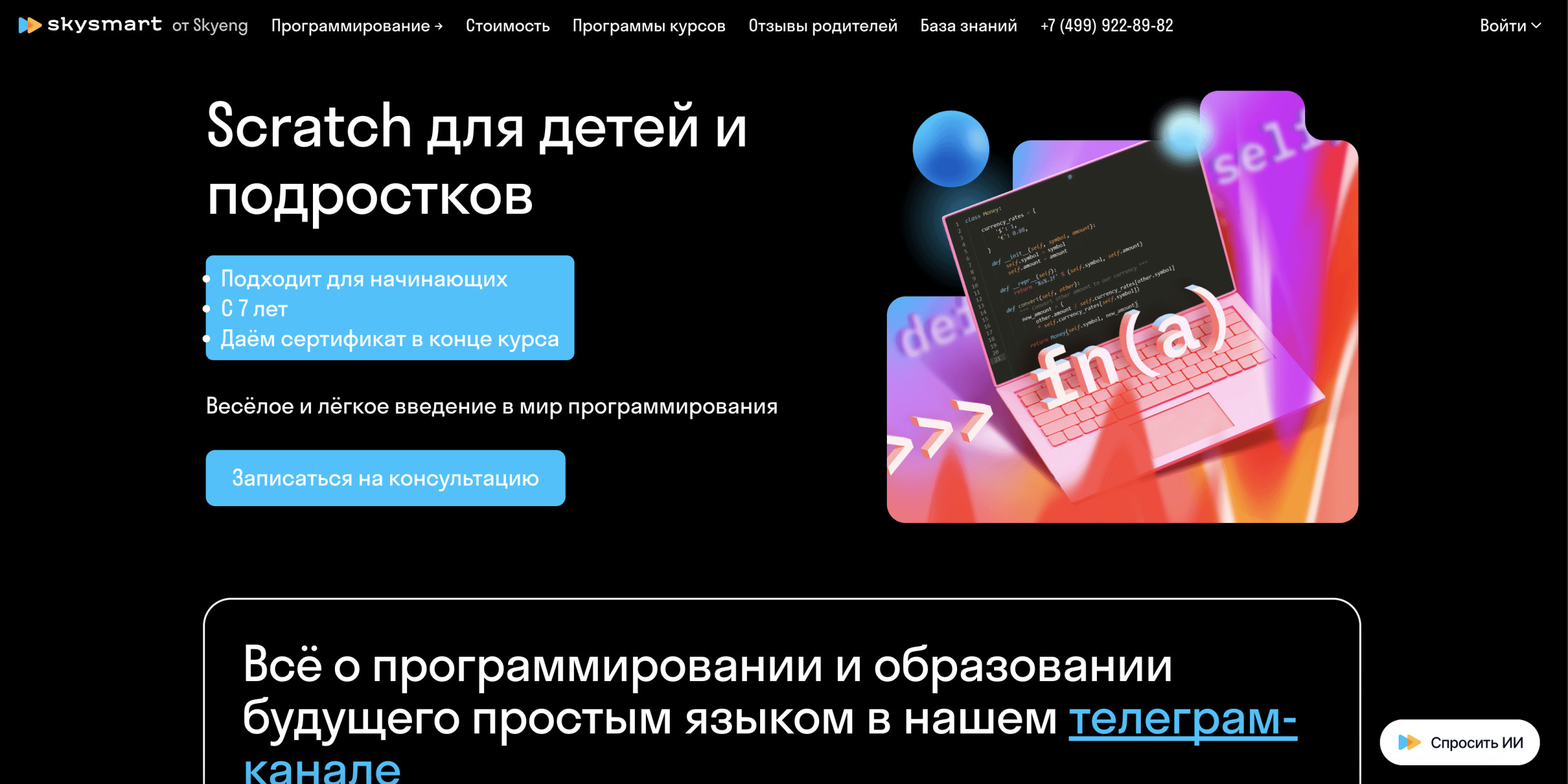 Skysmart — онлайн-платформа, которая предлагает различные образовательные программы для школьников. Среди них есть курсы программирования, где дети знакомятся с Scratch и создают простые игровые проекты.