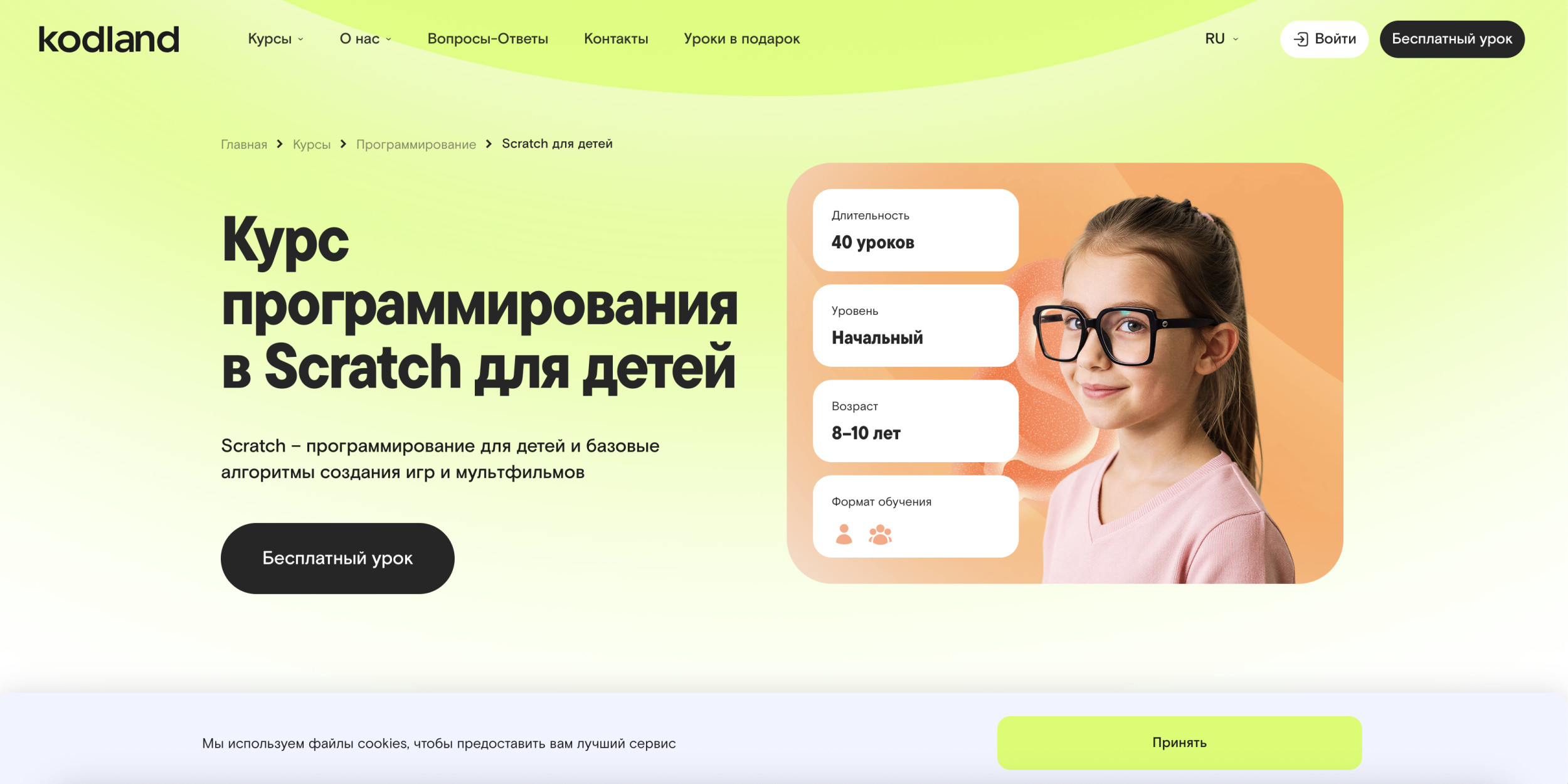 Kodland — международная онлайн-школа программирования для детей. В некоторых курсах используется Scratch как инструмент для знакомства с алгоритмами и логикой программирования.