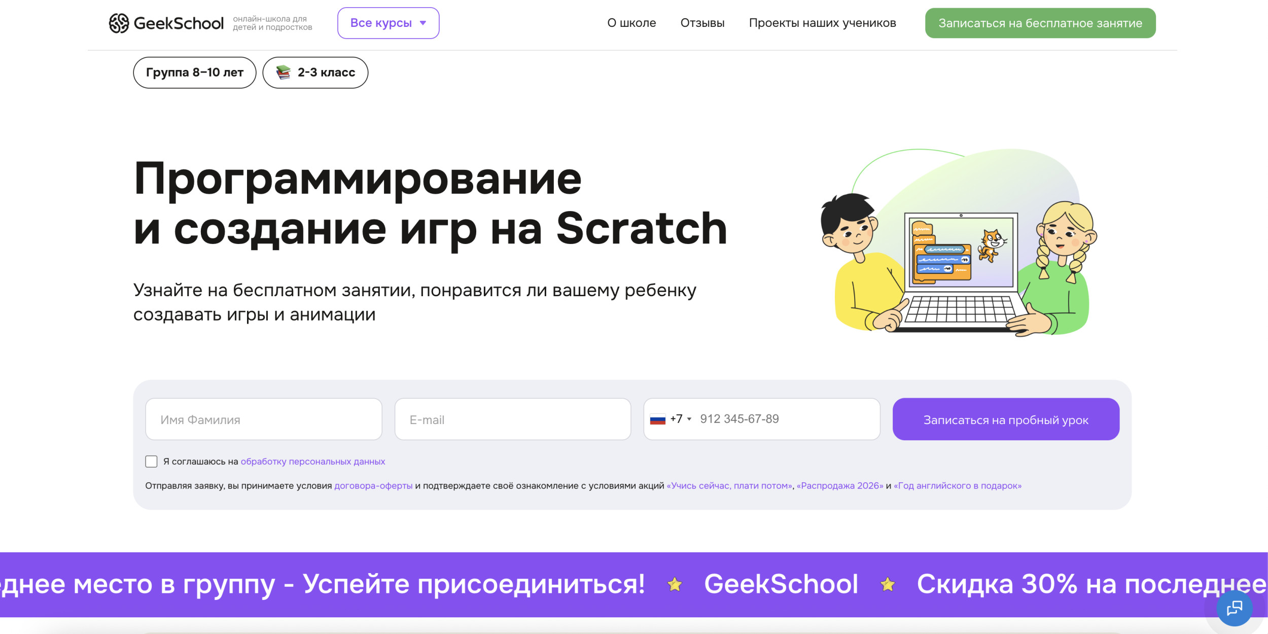 GeekSchool предлагает курсы программирования для школьников, включая обучение визуальному программированию. Scratch используется как один из инструментов для знакомства детей с базовыми принципами разработки.