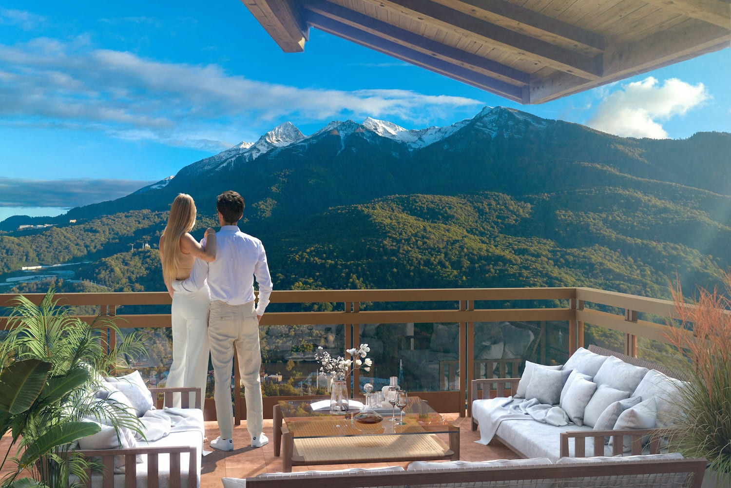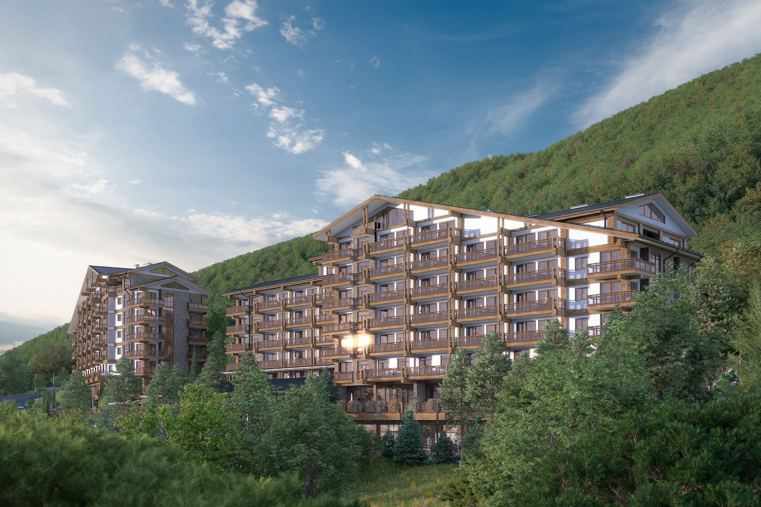 Проект — два корпуса по восемь этажей. Внутри — закрытый бассейн и SPA‑центр. То есть это не про «приехал, покатался и уехал», это про полноценный курортный образ жизни: горные виды, восстановление, уход за собой и возможность не чувствовать вину за день без склонов.