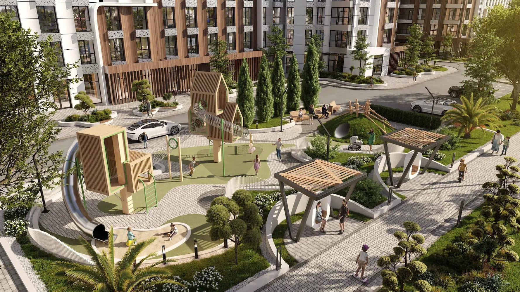 По разрешению на строительство от ноября 2023 года комплекс будет состоять из корпусов переменной этажности — от 12 до 21 этажа. Вентилируемые фасады — не дизайнерская прихоть, а необходимость в нашем влажном климате. Панорамные окна — максимум воздуха и света. Балконов минимум — чтобы ничто не мешало смотреть на лес, горы и спокойно обсуждать с банком свои ипотечные решения.