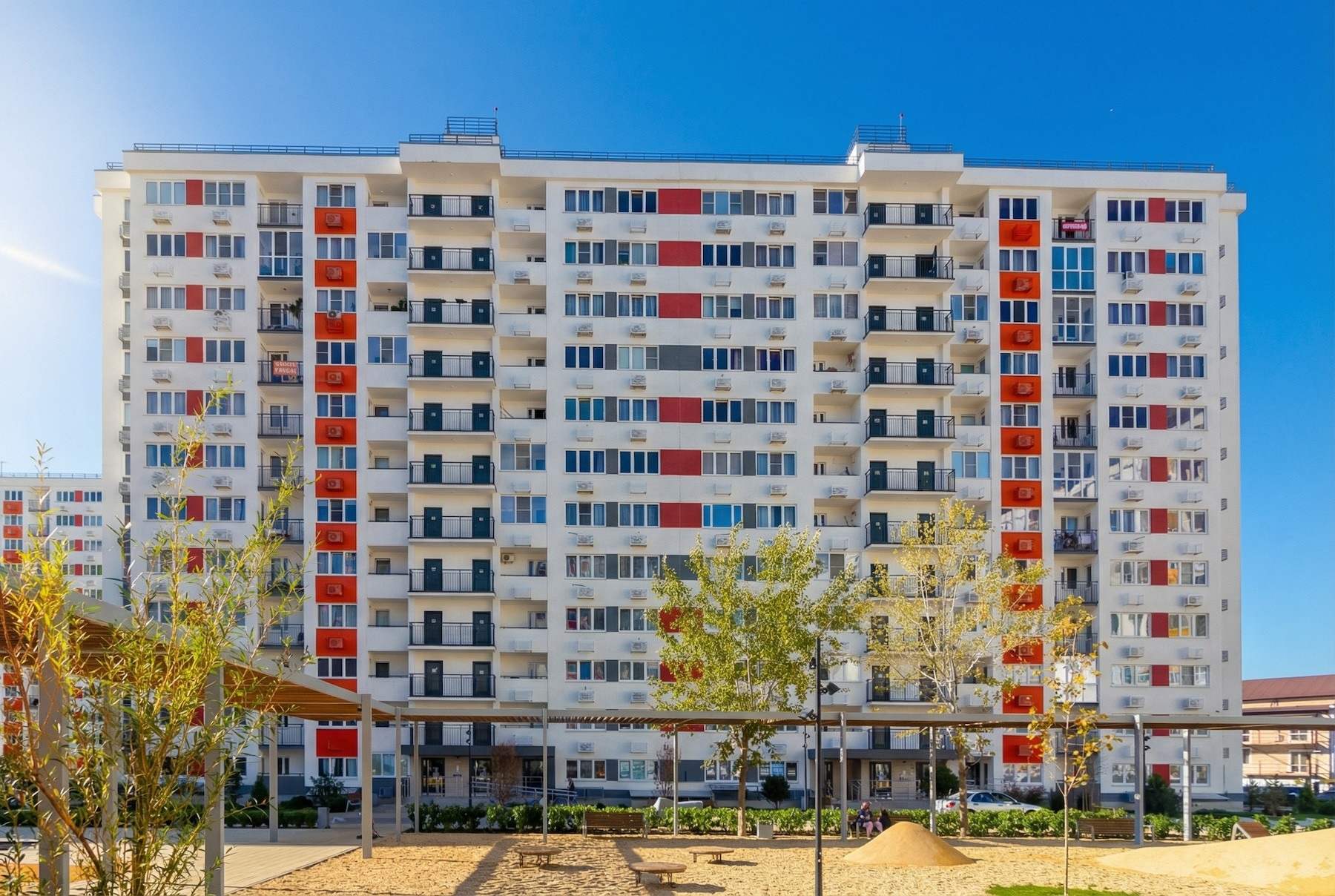Жильцы постепенно обживают квартиры: где-то меняют рамы, где-то застекляют балконы. В доме появляется индивидуальность — и авторский фасад понемногу превращается в живую городскую историю. Это нормально, потому что дом становится по-настоящему жилым.