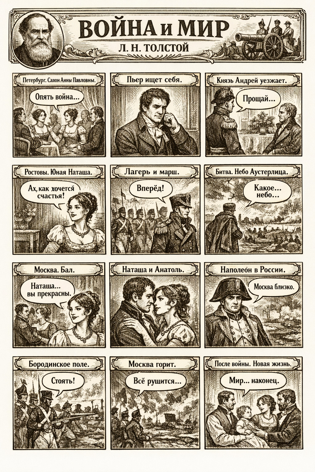 Говорю племяшке: «Слушай, забудь про всё это „автор хотел сказать“. Давай по-простому. Вот Пьер Безухов — это такой богатый неудачник, который всю книгу ищет смысл жизни. Как будто блогер-миллионник уехал в Тибет искать себя, только вместо Тибета — война с Наполеоном».