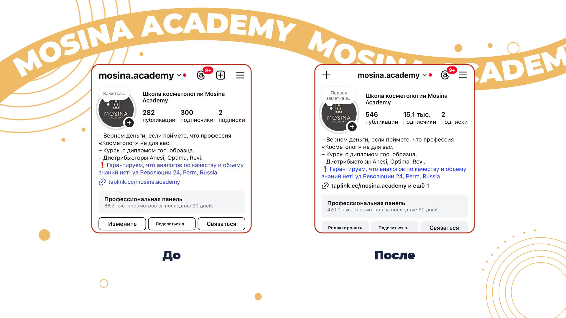 К нам обратилась Mosina Academy — школа эстетики и косметологии в Перми. Формально аккаунты были, но их эффективность стремилась к нулю. Reels набирали по 300 просмотров, контент был хаотичным и не попадал в целевую аудиторию практикующих специалистов. Соцсети не работали ни на узнаваемость, ни, тем более, на заявки. Задача стояла амбициозная: превратить страницу в мощный канал привлечения студентов.