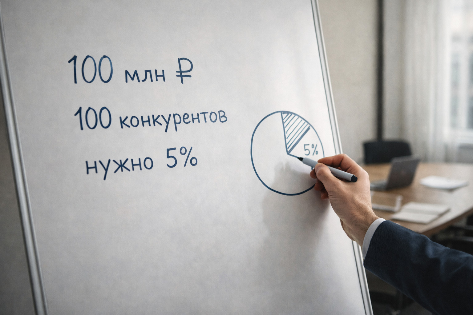 А теперь смотрим правде в глаза. Если на рынке 100 компаний и 100 млн денег, то средняя доля игрока — 1%. Вам нужно в 5 раз больше среднего. В условиях жесткой конкуренции откусить 5% у старых игроков — задача архисложная и дорогая.