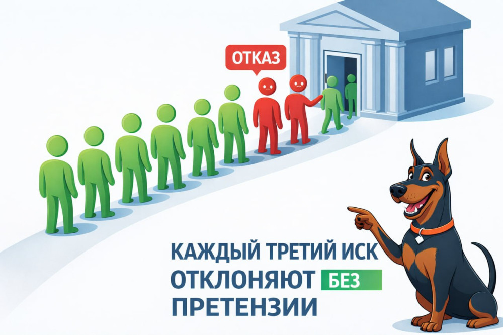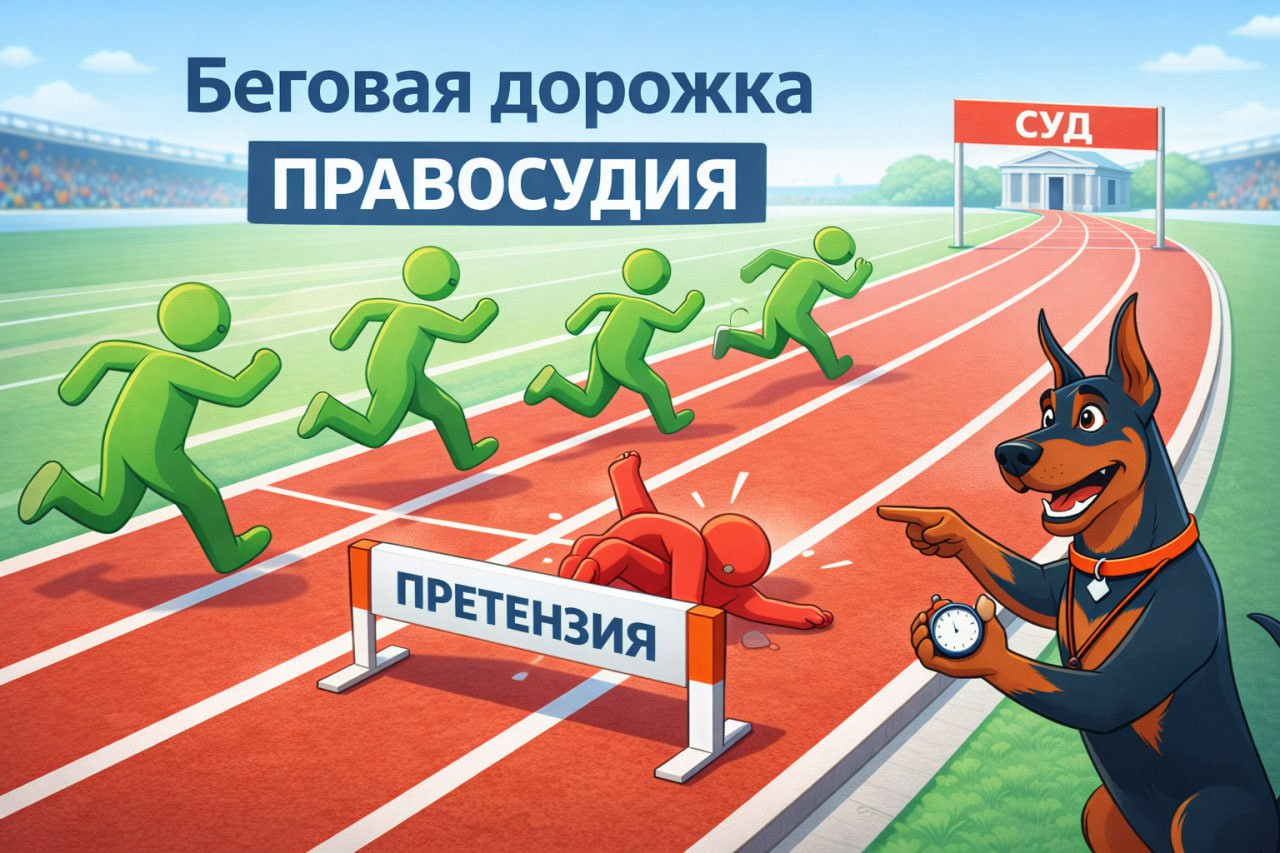 Идея: Показывает процесс подачи иска как забег с препятствиями, где первое же препятствие — самое коварное.