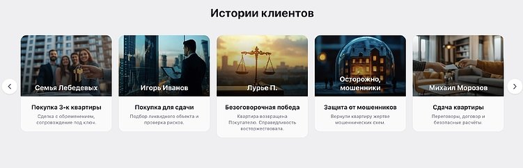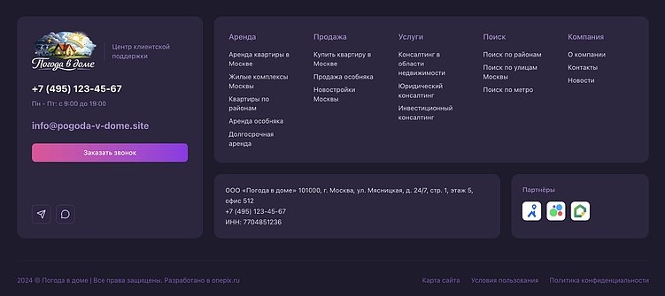 Ниже представлены истории довольных клиентов. Например: Также рассказываем о практиках, которыми будет делиться владелица сайта и риэлторской компании. Сайт полностью адаптивный: Контент на сайте целиком сгенерирован нейросетями: Внизу — аккуратный футер, где размещена вся подробная информация. Для реализации сайта использованы: Next.js 16 • React 19 • TypeScript (strict) • Tailwind 4 • Redux Toolkit • Docker • Feature-Sliced Design При классической ручной разработке: 2–3 месяца, копирайтер + дизайнер + фронтенд, стоимость около 2 млн рублей. При использовании нейросети: 1 неделя, 1 человек, кратно меньшая сумма. Мы предлагаем заказчику выбрать второй вариант. OnePix — Разработка для бизнеса, где технологии работают на результат