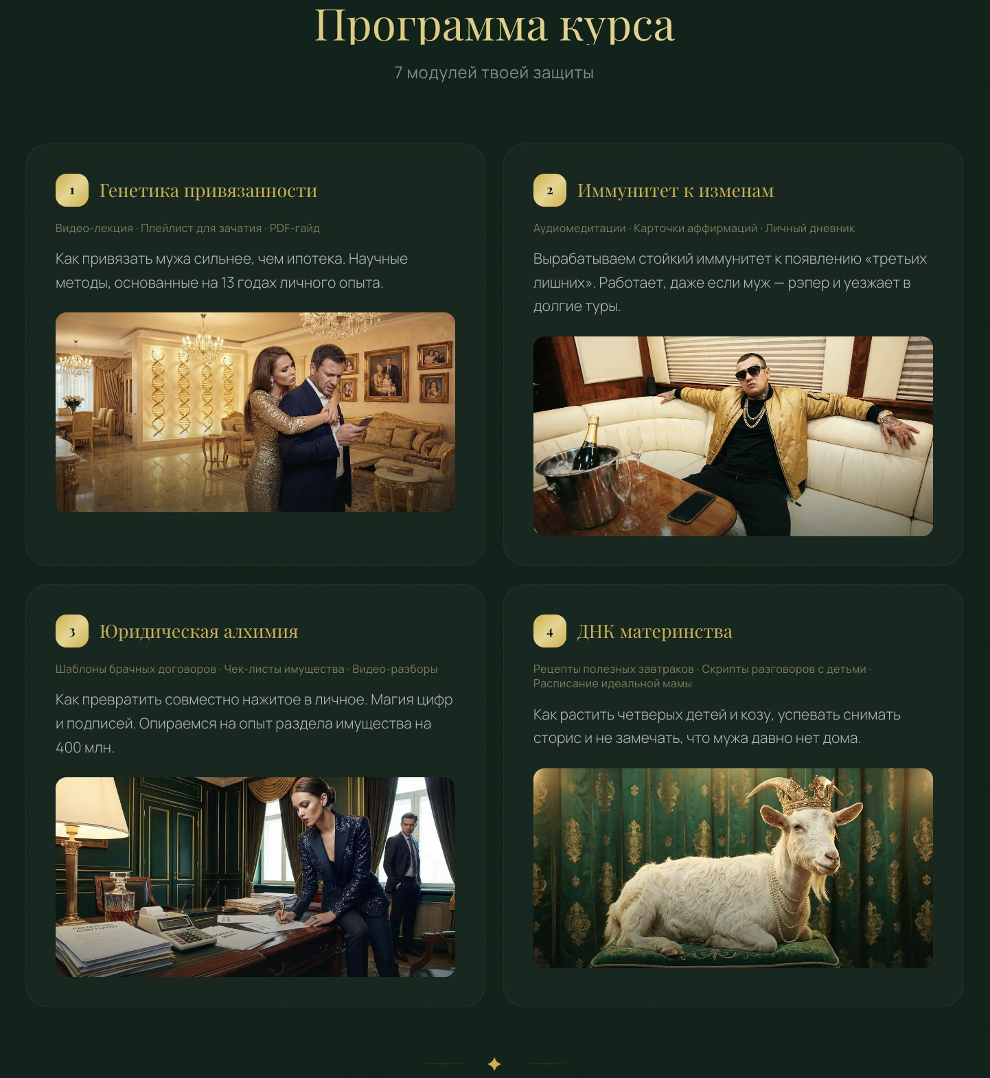 Оксана — человек, который уже имеет опыт в продаже курсов — ранее она предлагала вам заработать при помощи «Стратегии на миллион». Но мы же считаем, что ей необходимо завести свои собственные курсы по семейному счастью и благополучию.
