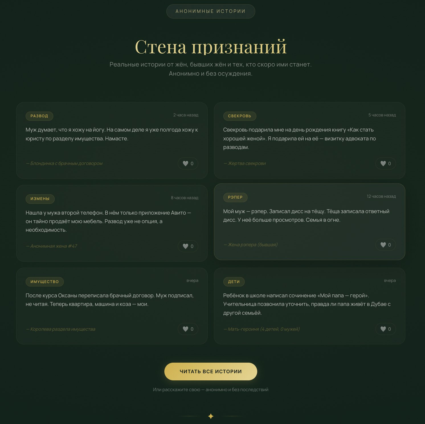имена, чтобы тексты на сайте звучали естественно. Защита от накруток (reCAPTCHA v3): чтобы на Стену признаний