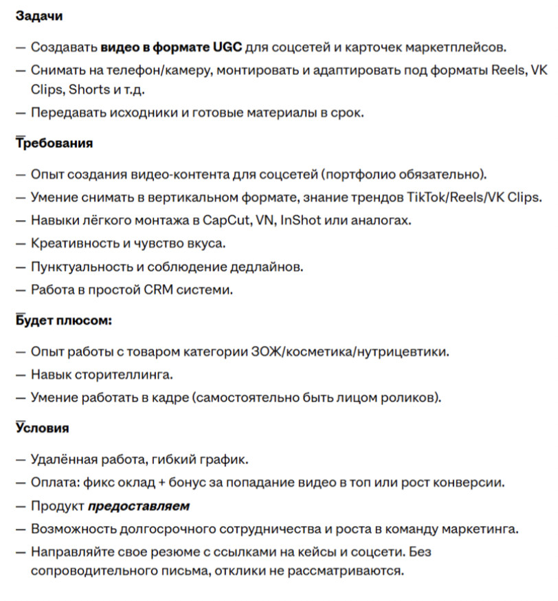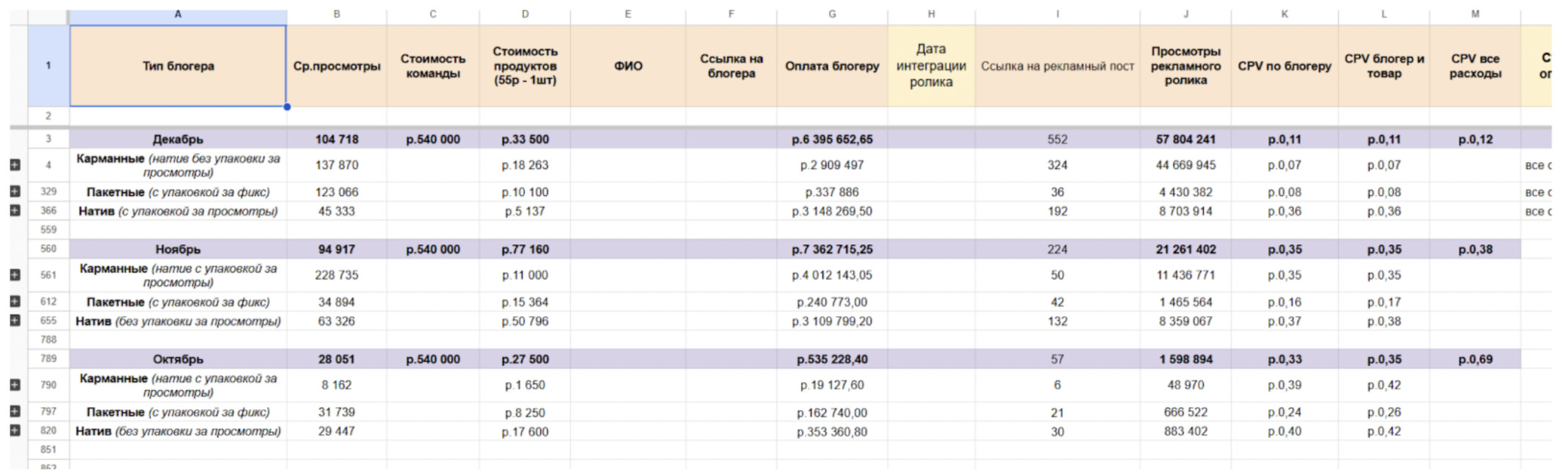 Суть реализованной механики Мы запустили контент-завод — систему покупки рекламных интеграций у блогеров с различными моделями оплаты. Мы прекрасно понимаем, что десятки миллионов просмотров — это десятки миллионов рублей. Множество интеграций и множество менеджеров по работе с блогерами. Такая система в целом не может быть автономной, а масштабируется рублями и руками сотрудников. По умолчанию такой формат не подходит. Нам нужны ДЕШЕВЫЕ ОХВАТЫ. А дешевые охваты можно делать через микроблогеров (до 10 000 подписчиков с активной аудиторией) за счет их низкой цены. Мы выбрали 3 типа блогеров: 1. Карманные блогеры — это маленькие звездочки, у которых мало подписчиков, просмотров, но горящие глаза, и они хотят снимать. 2. Пакетные блогеры — обычные коммерческие блогеры, но при покупке пакета на 5 интеграций мы скидывали по 25-40% от первоначальной стоимости. 3. Нативные блогеры (product placement) — продукт в кадре, но не объект рекламы. Нативно, дешево с оплатой за просмотры. Карманные блогеры Это маленькие блогеры до 10к подписчиков и просмотрами на роликах до 3к. К ним еще не идут толпами рекламодатели, и они недавно начали, поэтому полны сил и энтузиазма. Мы предложили им снимать 2 ролика в день и публиковать на 4-5 площадках (Нельзяграме* / TikTok / YouTube Shorts / VK Video). Иногда использовали likee и Yappy, но на старте это не лучшее решение. Мы предлагали 2 формата работы: 1. С оплатой за просмотры по ставке CPV 2. Официальное трудоустройство с окладом и KPI, напрямую привязанным к просмотрам. Блогеры получали бонусы за общий объем набранных просмотров, при этом каждый следующий уровень роста увеличивал вознаграждение. Механика была выстроена так, чтобы рост охватов напрямую влиял на доход: расти и усиливать контент было финансово выгодно. Расчет выглядел примерно так: 1 блогер — это 60 уникальных роликов, 240 публикаций, 3500 средние просмотры, 840к — 1,5млн просмотров в месяц. С расходами на него от 60.000 руб. до 100.000 руб. Таких блогеров мы собрали около 15 человек и на старте работали по модели CPV. Нам важно было не платить фикс за результат, которого может не быть: ролик сняли, выложили, а он собрал десятки просмотров. Для нас это риск, так как оплата проводится в полной мере. Но с таким оффером блогеры не особо охотно идут на контакт, так как рынок уже переполнен офферами «снимай, а потом, может быть, заработаешь». Это звучит для блогеров примерно как предложение поработать без зарплаты, но с верой в светлое будущее. Поэтому мы сделали простой и логичный ход. Добавили велком-бонус — фиксированную оплату за первые ролики. По сути, дали блогеру возможность спокойно зайти, попробовать формат, увидеть реальные цифры и понять, сколько он может зарабатывать на объеме. После этого разговор резко менялся. Вместо сомнений появлялся интерес, вместо возражений — вопросы про рост. Мы по-прежнему платили за результат, но точка входа стала простой. В итоге мы не отказались от своей цели — получать дешевые охваты, но упаковали ее в понятный и честный оффер. Хороший пример того, как небольшое изменение механики решает проблему, которую рынок в лоб просто не принимает. В целом CPV формат очень мотивирует креаторов делать контент более качественным, нежели брать количеством. Они начинали правильно ставить свет, готовить хуки, девушки использовали яркий макияж. Результаты: 1 месяц — 48.000 просмотров на 19.
