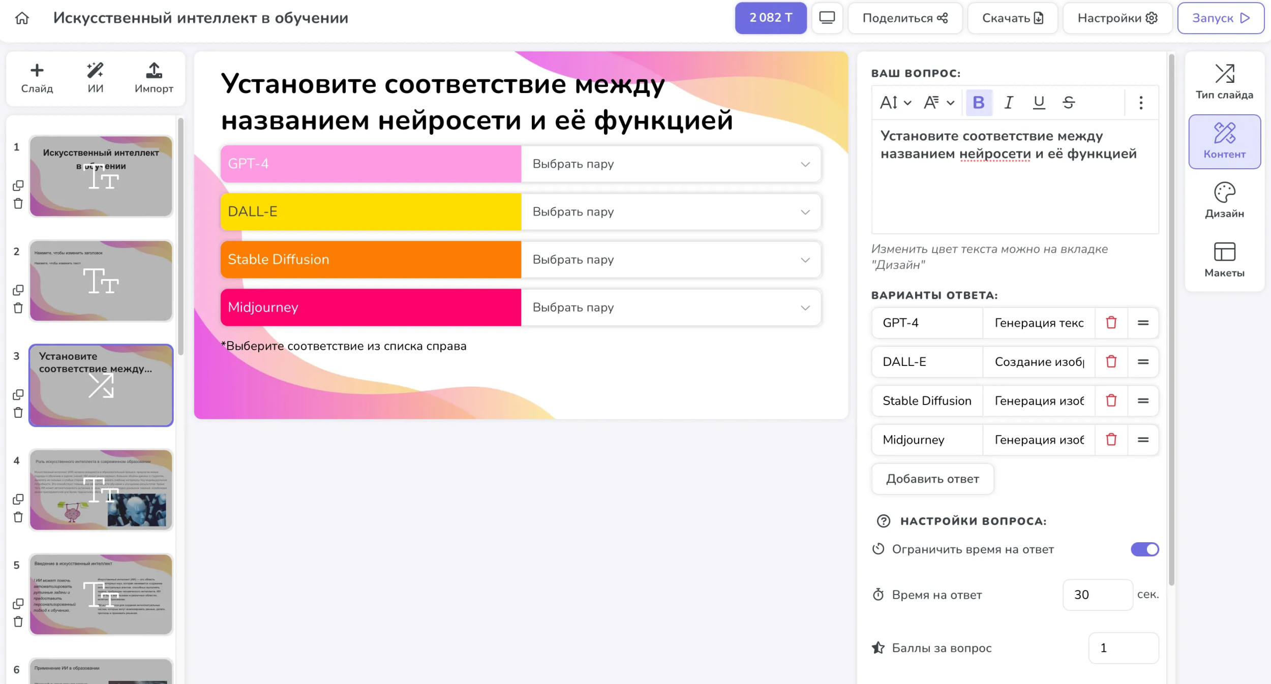 - Нейросети — генерация текстов и изображений прямо в конструкторе для быстрого наполнения слайдов .