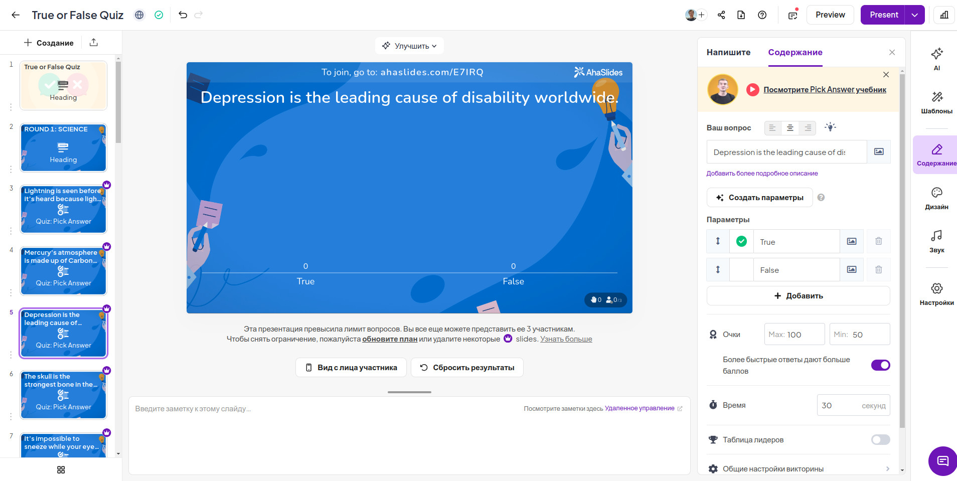 AhaSlides предлагает бесплатный план с базовым функционалом: