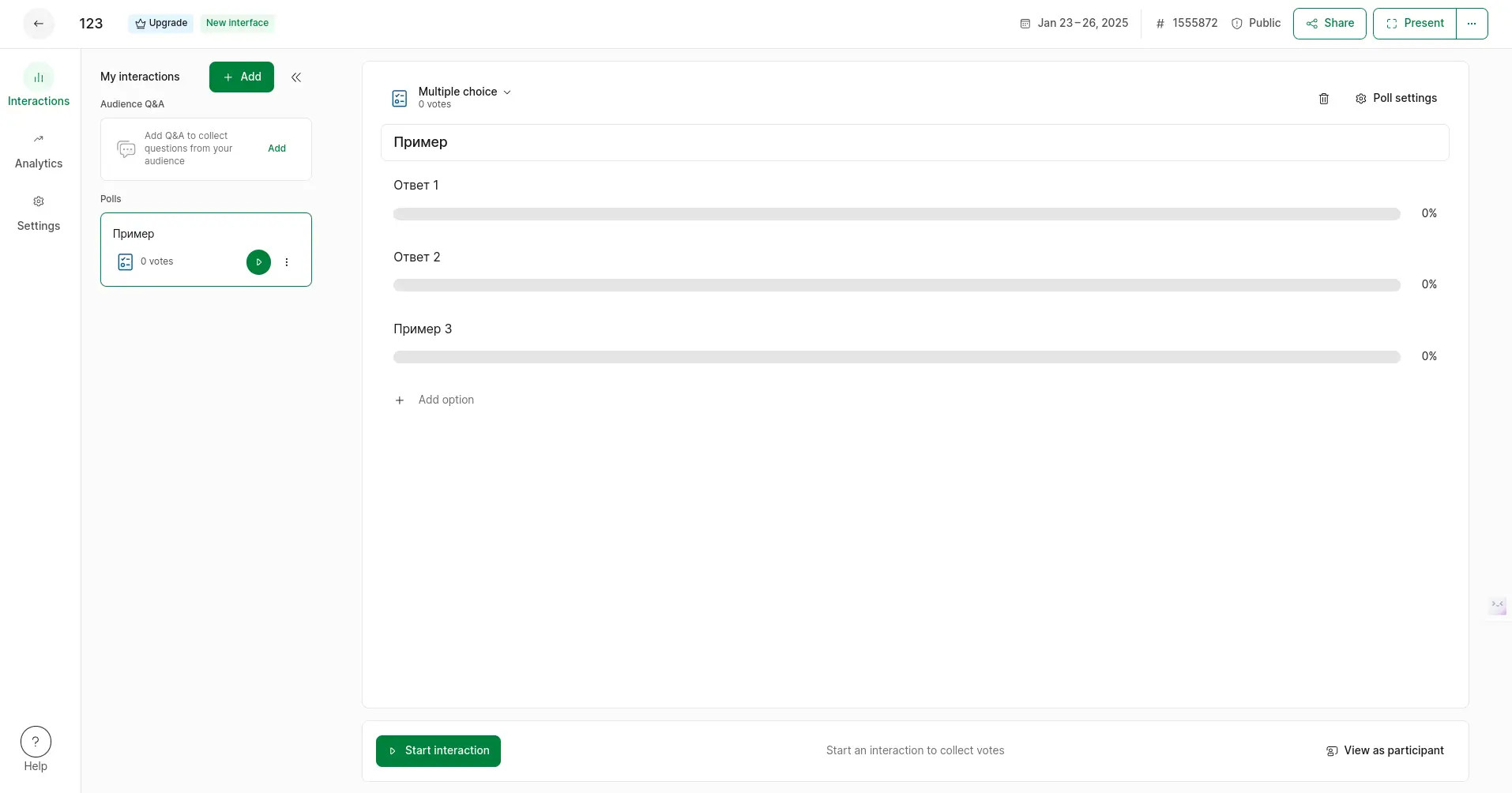 Бесплатная версия подойдёт для знакомства с платформой, но для полноценной работы с аудиторией (особенно для сбора регистраций и продвинутой аналитики) потребуется подписка. Также механики тестирования здесь уступают специализированным игровым платформам — Interum создан прежде всего для презентаций и сбора фидбэка, а не для сложных квизов . Продукт сложнее в настройке и меньше похож на Ментиметр.