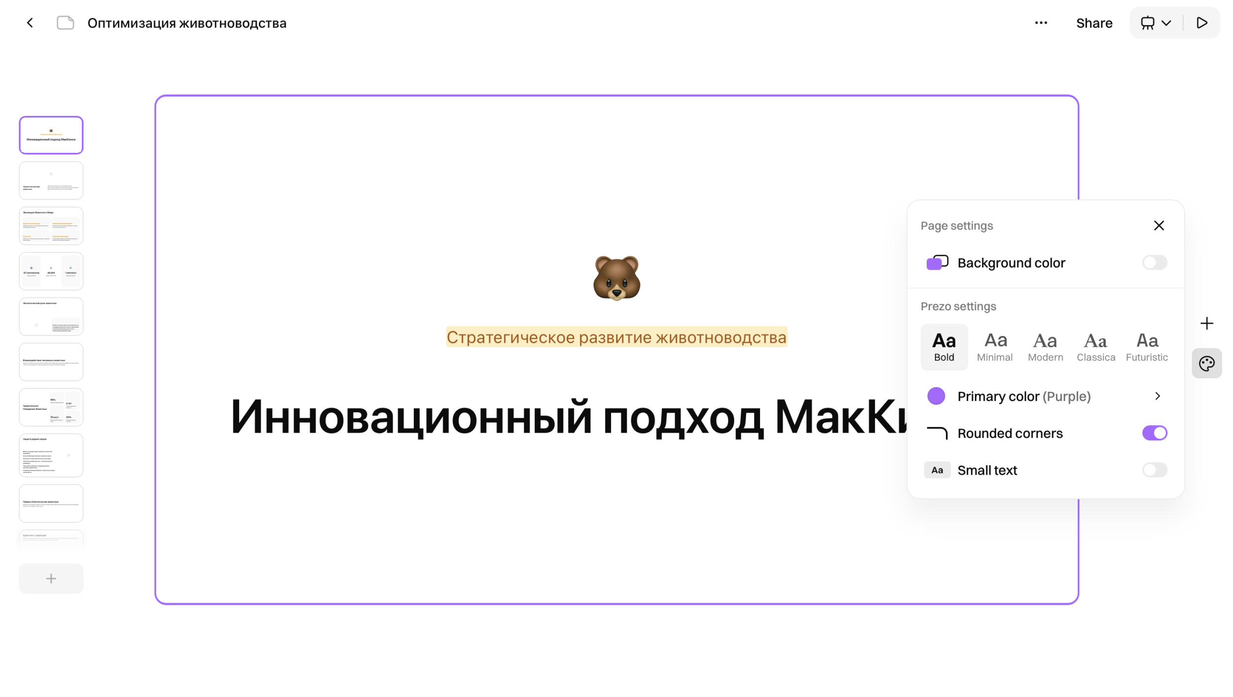 Платформа ориентирована на тех, кто ценит скорость и не хочет погружаться в тонкости дизайна. Prezo подходит для подготовки: