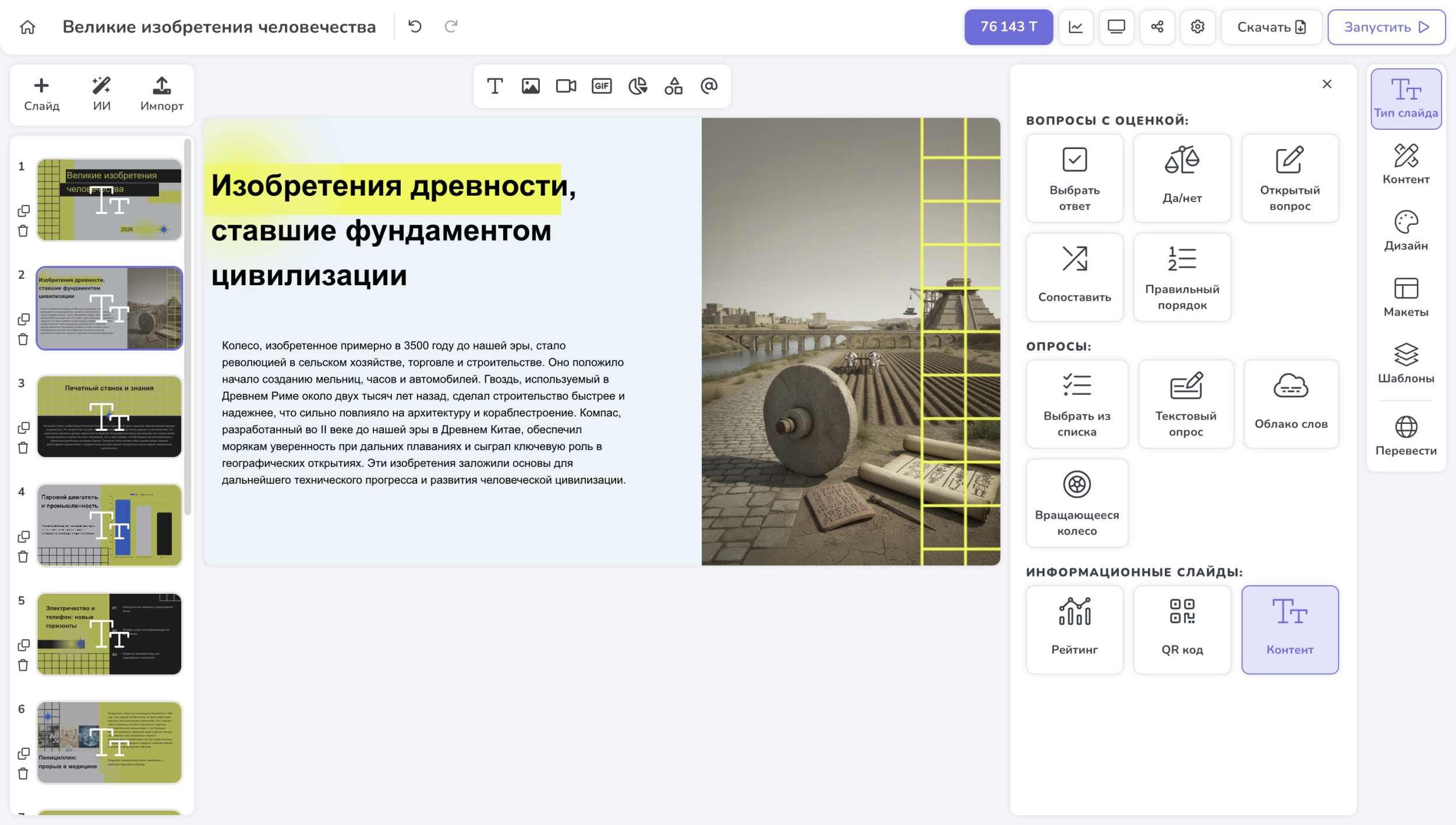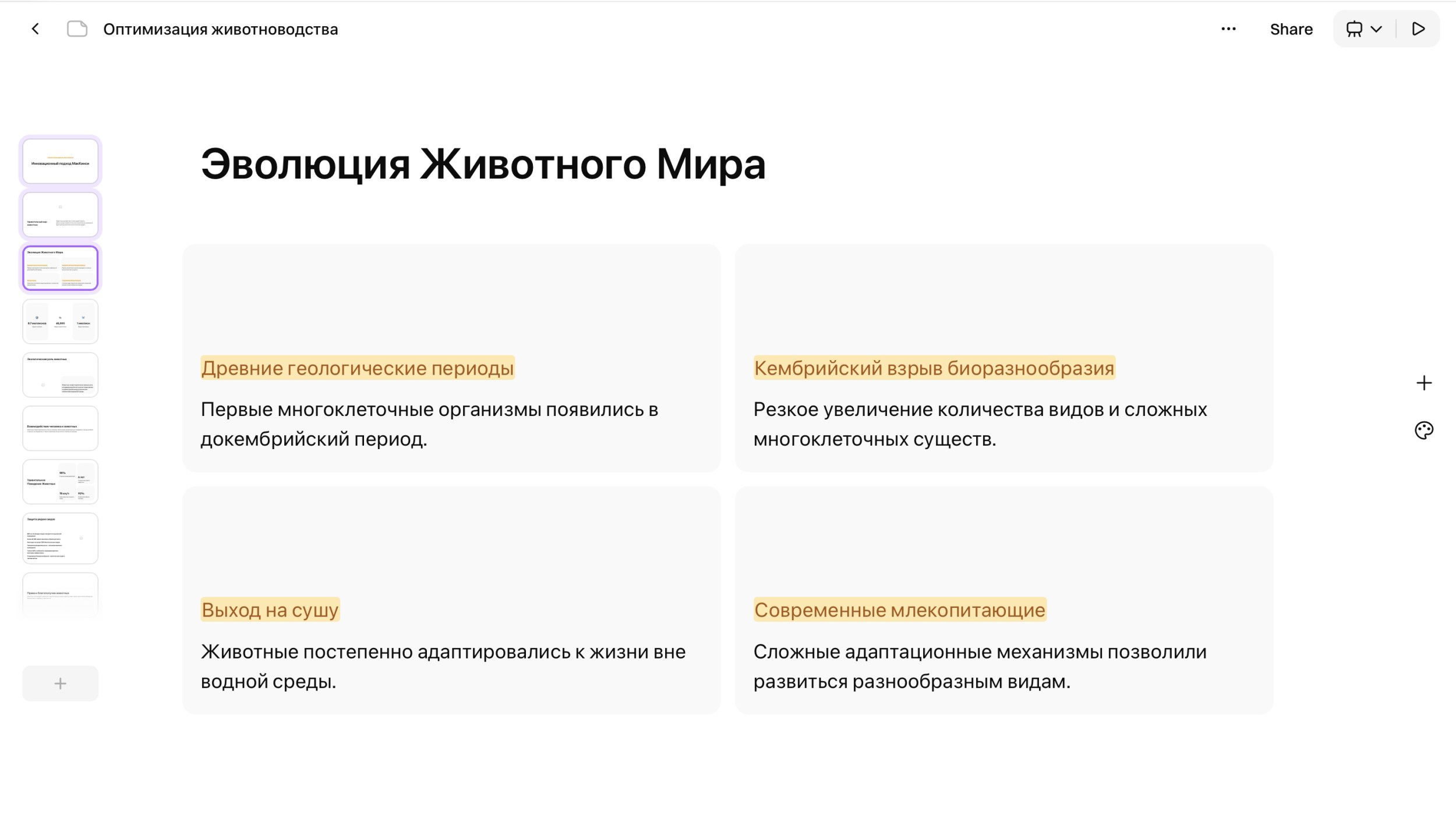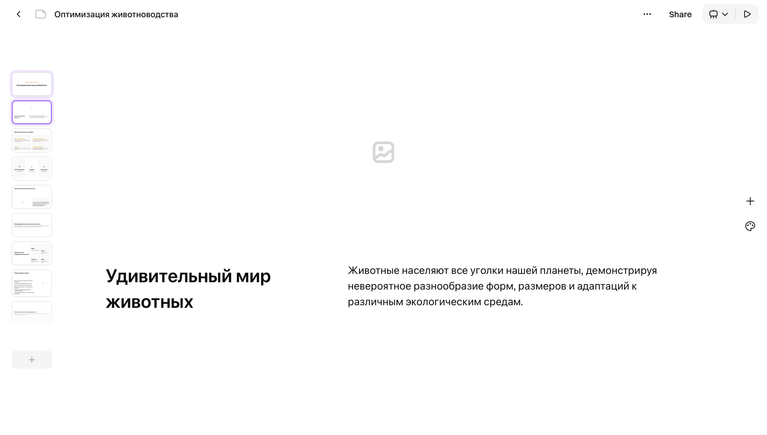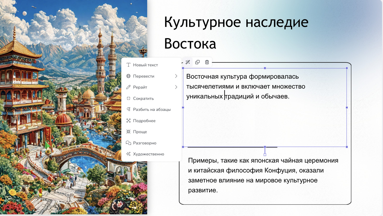 - Редактирование текста через ИИ. Встроенный помощник умеет сокращать, расширять или переписывать тексты на слайдах прямо в редакторе.