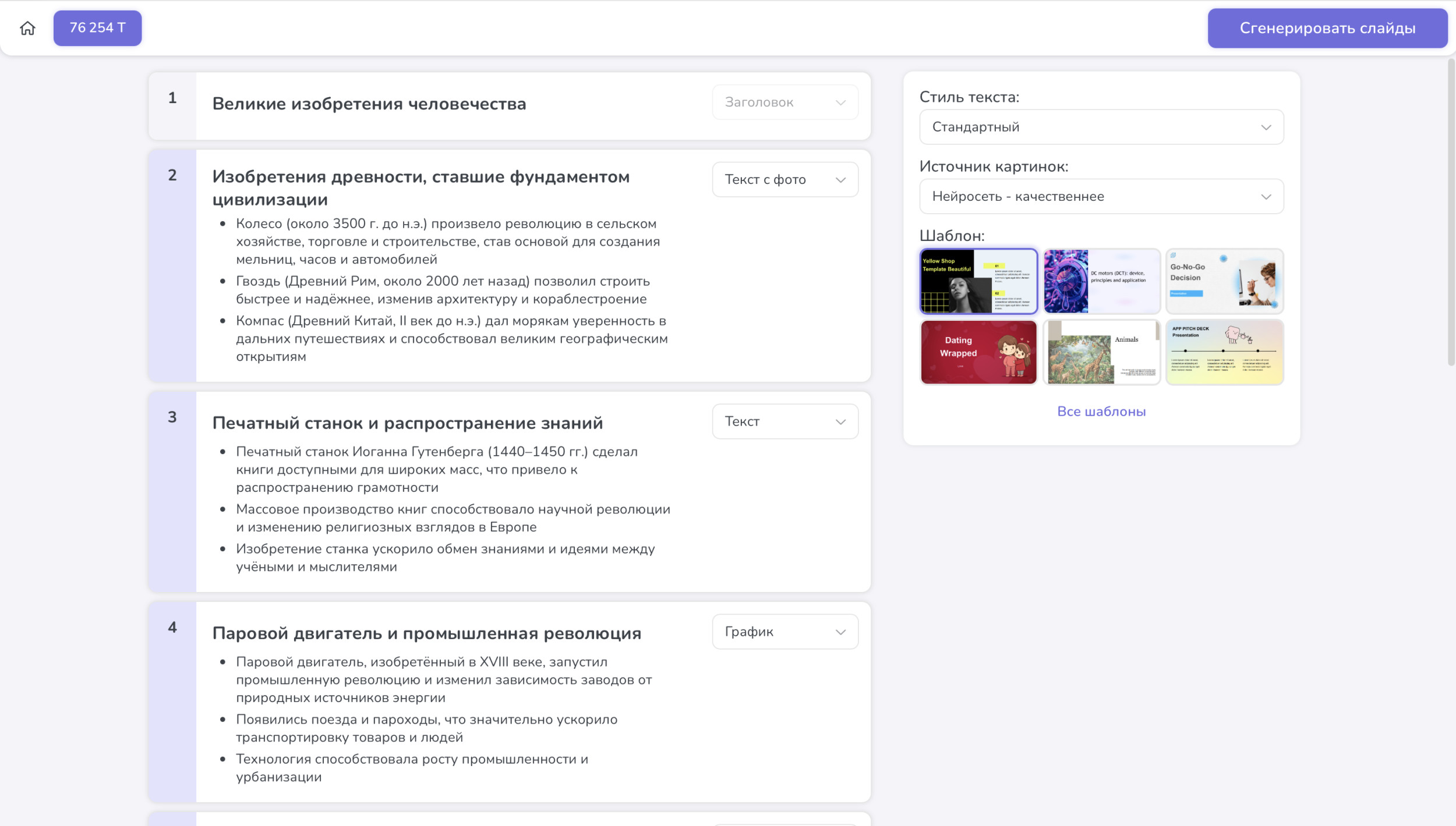 - Автоматическое создание иллюстраций. Сервис не просто подбирает изображения из стоков, но и генерирует уникальные картинки с помощью встроенной нейросети.