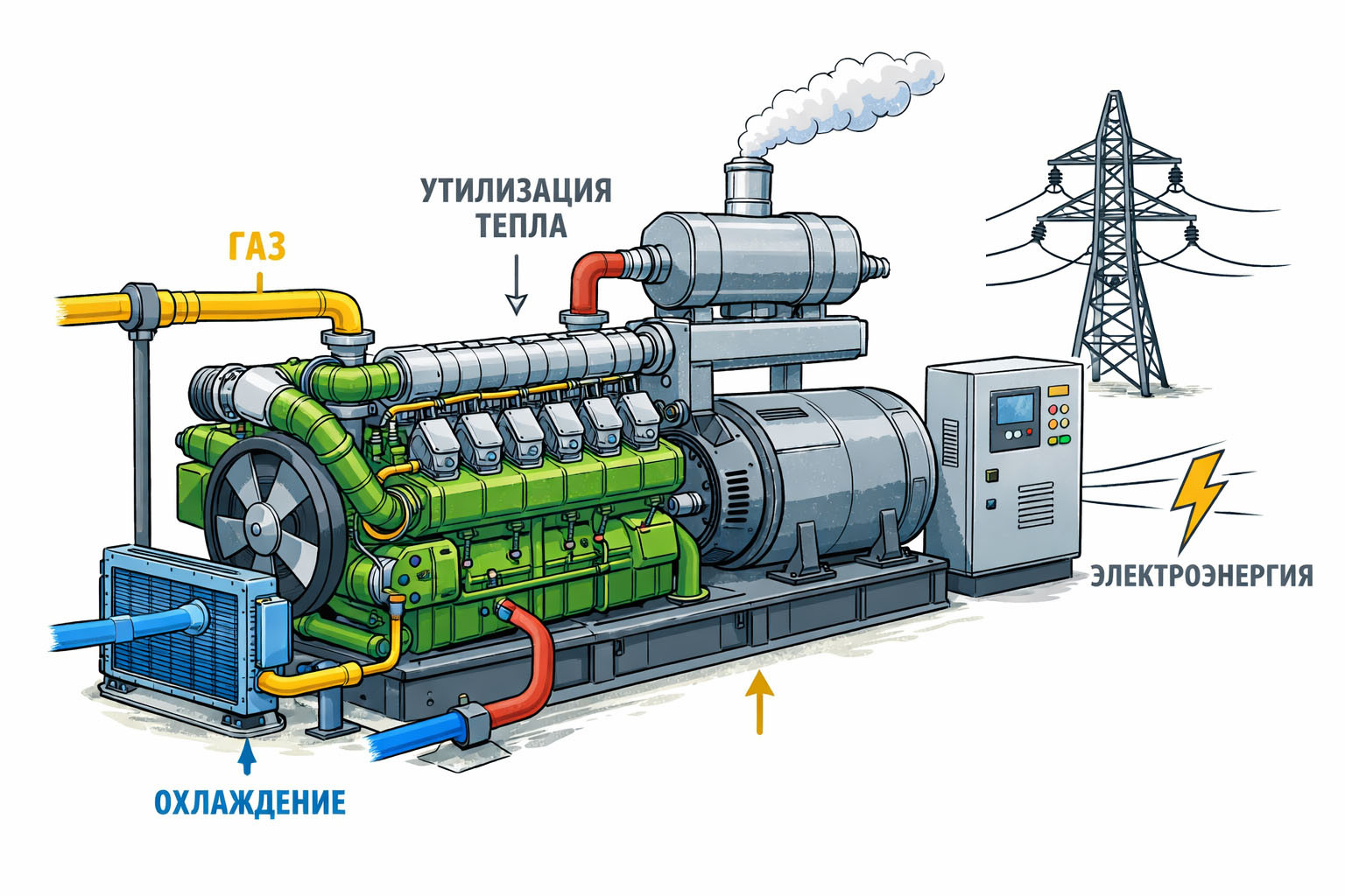Ключевые элементы ГПУ: газовый двигатель, электрогенератор, система охлаждения, система утилизации тепла, блок управления, автоматики и синхронизации. Типовая мощность одной установки — от 0,5 до 10 МВт. Проекты для майнинга часто строятся модульно: несколько агрегатов объединяются в единую энергосистему на 5-50 МВт и выше. Главное отличие ГПУ от дизельной генерации — более низкая себестоимость выработки при наличии доступа к недорогому газу и более высокая топливная эффективность. По электрическому КПД современные газопоршневые установки достигают 40-45%. При использовании тепла выхлопных газов и охлаждающих контуров (в режиме когенерации, т.е. когда одновременно вырабатывается и электричество, и тепло) совокупный КПД может превышать 80%. Для дата-центров это особенно актуально, так как тепло можно использовать для обогрева помещений или в смежных промышленных проектах. Принцип работы прост. В цилиндры двигателя подается газовоздушная смесь. Смесь воспламеняется, создавая давление. Поршни приводят во вращение коленчатый вал. Вал вращает генератор, который вырабатывает электрический ток. Т.е. химическая энергия превращается в механическую. Ключевой фактор — стоимость газа. При доступе к магистральному природному газу по промышленному тарифу (или к попутному нефтяному газу на месторождениях) себестоимость электроэнергии может быть ниже средних сетевых тарифов для коммерческих потребителей. При майнинге криптовалют обычно сталкиваются с двумя проблемами. Первая проблема — большое по объему и дорогое энергопотребление. Цена на электроэнергию для юрлиц обычно составляет 5-8 руб. за кВтч (зависит от региона и времени суток). ГПУ дают 1,5-2 рубля за кВтч. Разница ощутимая. Вторая проблема — перебои в подаче электроэнергии, которые приводят к потери прибыли. ГПУ устраняют и эту проблему. Другие преимущества: 1)Предсказуемость себестоимости энергии. При долгосрочном контракте на поставку газа цена киловатта фиксируется на годы. 2)Автономность. Генерация проводится вне централизованных электросетей. 3)Масштабируемость. Новые модули можно добавить без сложной реконструкции. 4)Различные по диапазону мощности. Мощность определяет заказчик установки. 5)Экологичность. Если все правильно сделать и настроить нужным образом, то вредные выбросы минимальны. 6)Минимальные размеры. Если сравнить размеры ГПУ с традиционными электростанциями. Сценариев использования несколько. 1.Промышленные предприятия и сфера ЖКХ Заводы, фабрики, объекты сельского хозяйства, энергоснабжение жилых домов, школ, детских садов — подобные установки применяются в разных сферах. И в разных режимах. Например, в автономном режиме газопоршневая установка может использоваться для собственных нужд предприятия, без использования внешних электросетей. В параллельном или синхронном режиме подключение к внешним сетям производится для получения дополнительных мощностей или для резервирования. 2. Нефтегазовые объекты Попутный нефтяной газ (ПНГ) часто сжигается в факелах на нефтегазовых объектах из-за отсутствия инфраструктуры по его переработке. Установка мобильных ГПУ позволяет монетизировать такой газ, снизить экологические издержки, обеспечить вахтовые поселки и буровые станции дешевой электроэнергией. Такой подход интересен нефтяным компаниям, которые з