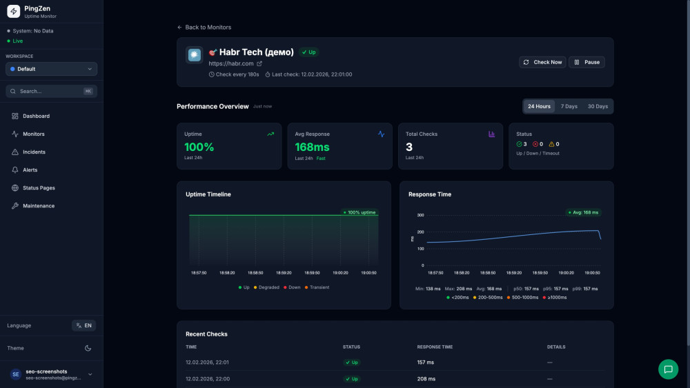 Статус-страницы создаются в один клик: красивый URL, SSL, история аптайма. И никакой рекламы PingZen — даже на бесплатном тарифе.