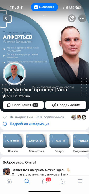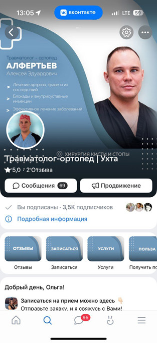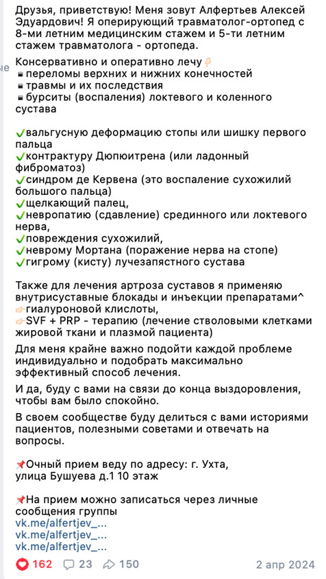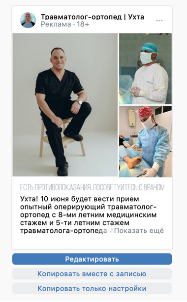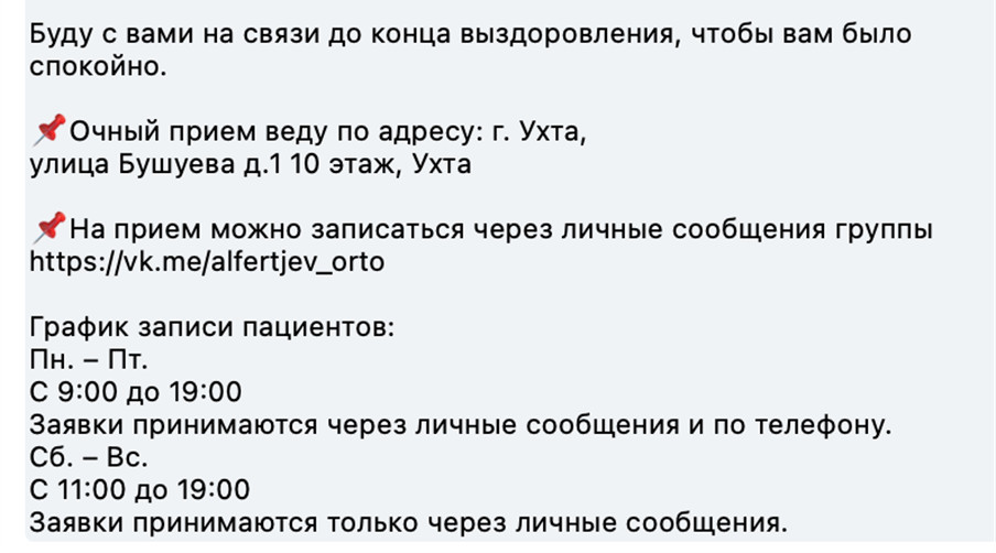 Что касается упаковки, мы сосредоточились на том, чтобы создать удобные точки контакта и упростить маршрут пациента. Это позволило ему легко понять, в какое сообщество он попал, чем оно может ему помочь и как записаться на прием. Кроме того, мы добавили призыв к действию в описание и в именованный виджет, чтобы пользователи могли сразу перейти к форме заявок или оставить сообщения в сообществе и записаться на прием. Контент стратегия. Рубрикатор постов: Каждая из этих рубрик позволила нам эффективно взаимодействовать с аудиторией, а также успешно закрыть их возражения, страхи и вопросы. Таргетированная реклама. Ежемесячный бюджет: 15–20 тыс. руб. (по региону) Реклама запускалась очень точечно. Мы тщательно собрали базу для ретаргета, это позволило снизить цену конверсию как в запись, так и в операции. Были запущены рекламные кампании на: — Промотирование избранных постов для наших подписчиков и дополнительных аудиторий с целью прогрева и получения заявок (99 заявок по 473 руб.). — Кампания на продвижение SVF (30 заявок по 495 руб., средний чек 55-70 тыс. руб.). — Кампания на запись на приемы (659 заявок по 302 руб., средний чек 2500 руб.). — Кампания на продвижение внутрисуставных блокад (8 заявок по 679 руб., средний чек 15000 руб., в данный момент выключена). Запись на прием выступает нашим фильтром как для внутрисуставных инъекций, так и для хирургических операций, так как пациенты в любом случае приходят к нам через прием. Заявки на приёмы. Объявления, которые показали наилучший результат. Что залетело? Такие посты приносят самую маржинальную заявку на операции + новых подписчиков, которых мы прогреваем контентом. Привет, выгорание. Давайте прощаться) Кажется, мы подходим к важному моменту. Хочу начать с того, что в начале нашего пути мы получали всего 30 обращений в месяц, а сейчас их количество выросло до 600 обращений благодаря контенту и рекламе. Также количество входящих звонков увеличилось до 100. Это частая проблема, когда привлечение пациентов из интернета растет, а система обработки не готова. Но что произошло? На одной из встреч Алексей Эдуардович сказал, что нужно срочно обсудить ситуацию: — «Я так больше не могу.» — «Я не в ресурсе.» — «Я заканчиваю год с успокоительными.» — «Я начал делать ошибки.» Из-за многократного увеличения потока клиентов Алексею стало сложно самостоятельно обрабатывать все заявки. Результат: состояние «не в ресурсе», ошибки. Мало настроить автоворонку для клиники, нужно правильно обрабатывать заявки из рекламы. Это важный знак, что необходимо пересмотреть нагрузки и возможно привлечь дополнительную поддержку для команды. Мы приняли решение взять в команду ассистента или менеджера по обработке заявок, чтобы ввести порядок в этой сфере. Наша главная задача заключалась в повышении конверсии в доходимость, поскольку у доктора не было времени перезванивать, обзванивать пропущенные звонки и напоминать пациентам о записях. Итоги совместной работы с менеджером по обработке заявок: — В первый месяц работы конверсия из обращения в запись увеличилась на 22%. — Во второй месяц работа менеджера повысила конверсию из записи в доходимость на 39%. — В августе явка составила 100%. Алексей Эдуардович поделился: «Я счастлив, месяц прошел отлично, даже учитывая не сезон (июнь, июль)!» Эти результаты подтверждают, что правильная организаци