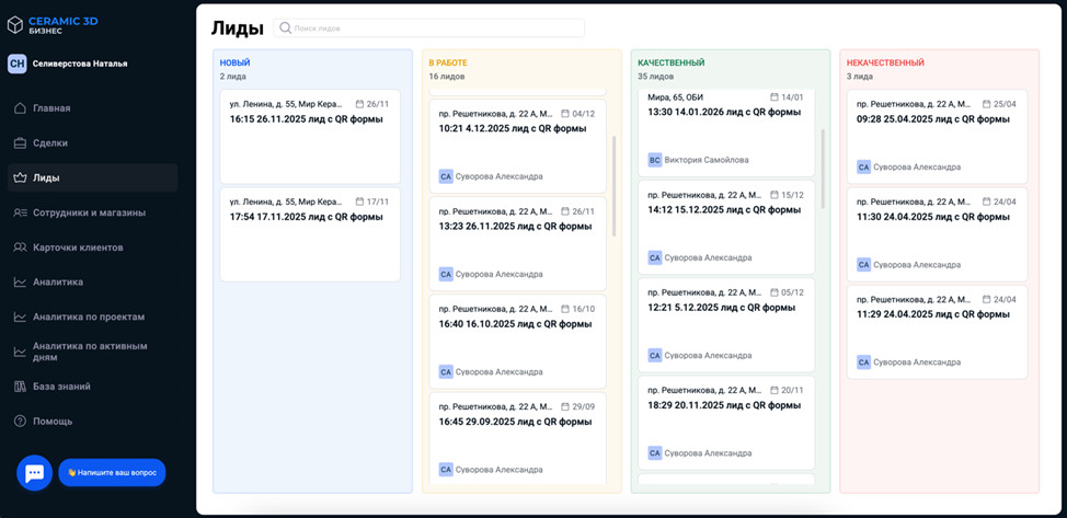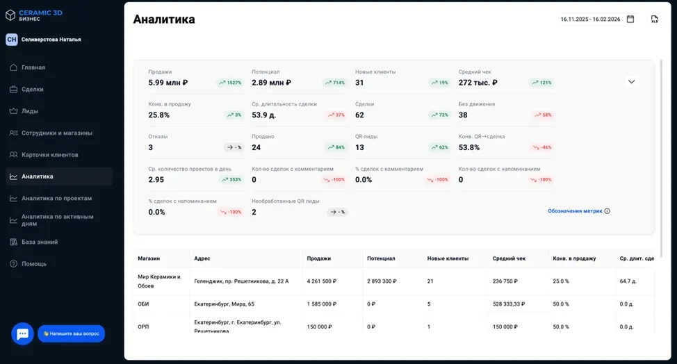 обновляются в режиме реального времени — по каждому магазину и по всей сети. Ceramic 3D