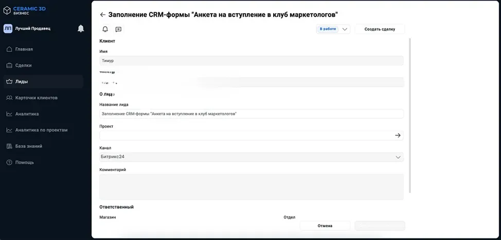 напрямую связанную с финансовыми показателями компании. реальными деньгами компании. Без системной аналитики невозможно понять: · какая доля маркетингового бюджета расходуется на привлечение клиентов, совершающих покупки, · какие сотрудники доводят потенциальных клиентов до покупки, · какие сотрудники лучше продают дополнительные позиции. Формула ROI проста: ROI = ((Доп. прибыль — Затраты) / Затраты) × 100% Но корректно посчитать её можно только тогда, когда: · источник обращения фиксируется в момент первого контакта; · клиент отслеживается по всей воронке продаж; · система позволяет увидеть весь путь клиента с момента первого обращения в компанию до момента получения фактической прибыли от продажи. Если этого нет, ROI считается «на глаз». Суть же в управляемой системе оценка эффективности маркетинга выглядит просто и прозрачно:затраты на рекламу сопоставляются с фактической выручкой и прибылью, которую принесли клиенты из этого источника. И это не про оценку количества кликов и охватов. Только фактическая прибыль. Ceramic 3D