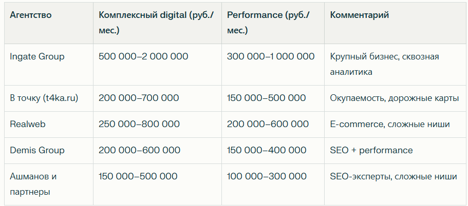 - Комплексный digital (полный цикл): от 300 000–1 500 000 руб./мес.