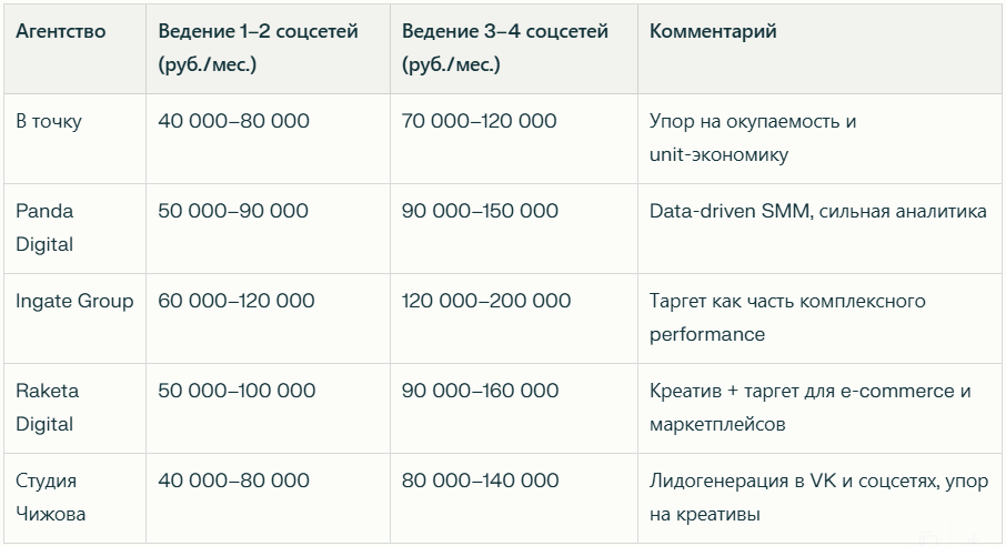 - Ведение кампаний в 2–3 соцсетях (VK, Telegram, myTarget и др.): 40 000–90 000 руб. в месяц за работу агентства, бюджеты обычно от 150 000–300 000 руб./мес.