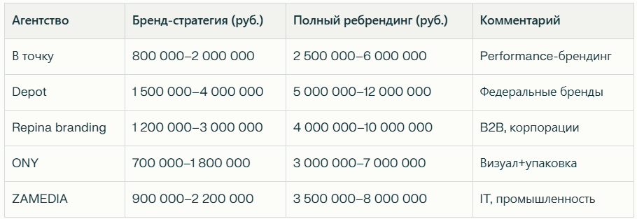- Бренд-аудит + стратегия: 500 000–2 000 000 руб.