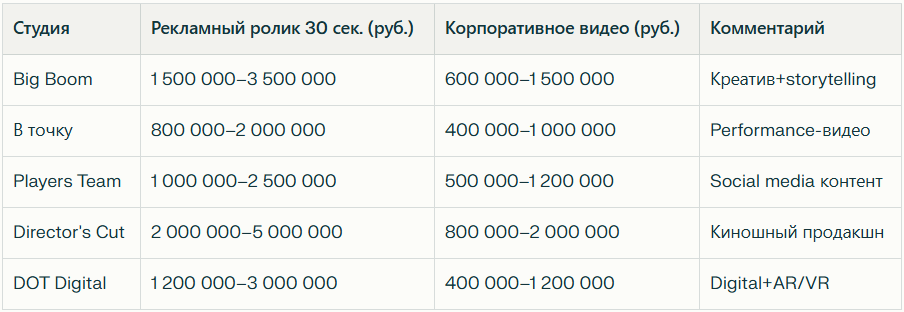 - Корпоративное видео 2–5 мин.: 300 000–1 200 000 руб.