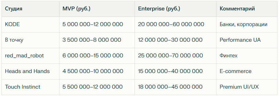 - Enterprise-приложение: 10 000 000–50 000 000 руб.