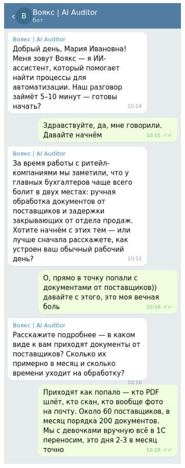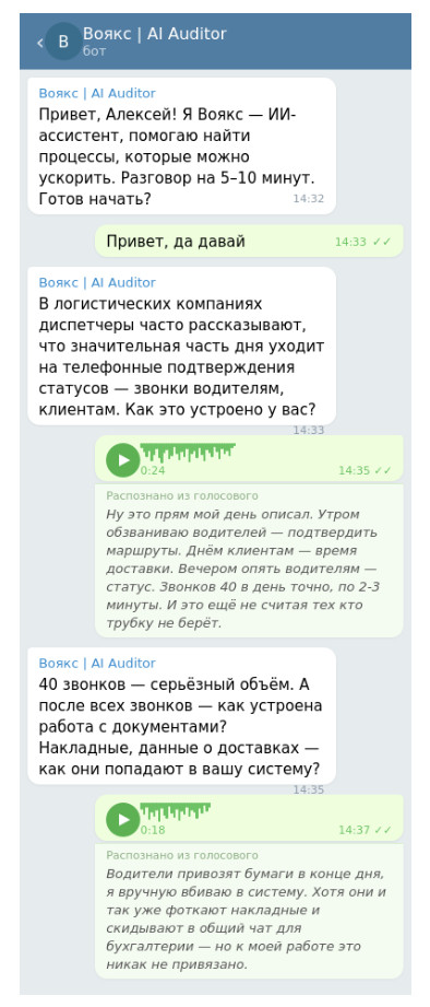 Собственными силами. ИТ-директор собирает совещание. Руководители отделов рассказывают — каждый про своё. Самые громкие голоса побеждают, тихие отделы остаются незамеченными. Решили «внедрить чат-бот в поддержку» — потому что это модно. А то, что бухгалтерия ежемесячно тратит 120 человеко-часов на ручную обработку документов, не всплыло — потому что главбух считает это нормой и не видит здесь задачу для ИИ. Инициативный ИТ-директор хочет действовать — но у него нет карты: где именно в компании ИИ принесёт максимальную пользу? С какого процесса начать? Где быстрые победы? Все эти подходы страдают одной общей болезнью: они не масштабируются. Ни один из них не может одновременно глубоко поговорить с каждым из 200 сотрудников, запомнить всё сказанное, сопоставить ответы из разных отделов и найти закономерности, которые видны только при взгляде сверху. Воякс решает именно эту задачу. Даже если вы планируете всё делать своими силами — он выполняет самую трудоёмкую часть работы: находит, где конкретно нужен ИИ, и даёт вам готовую карту для старта. Забудьте всё, что вы знаете о чат-ботах. Забудьте «нажмите 1 для продолжения» и заготовленные деревья вопросов. Воякс — это не опросник с ИИ-обёрткой. Это агент, который готовится к разговору с каждым сотрудником так, как не готовится ни один живой консультант. Первая сессия — и агент уже знает, о чём спрашивать Вот что происходит ещё до того, как сотрудник напишет первое слово. Агент получает информацию: Мария Петрова, главный бухгалтер, ритейл, подчиняется финансовому директору, отдел из 6 человек. Казалось бы — задать стандартные вопросы про рабочий день? Нет. Агент лезет в свою базу знаний — в накопленную экспертизу по всем предыдущим аудитам. И обнаруживает: в четырёх из пяти ритейл-компаний главбух жаловался на ручную обработку документов от поставщиков. В трёх — на задержки закрывающих документов от отдела продаж. В двух — на невозможность быстро получить аналитику без запроса в ИТ-отдел. Для роли «главбух в ритейле» уже есть карта типичных болей — и агент идёт на первую сессию не с чистого листа, а с набором гипотез, которые нужно проверить. Это, как если бы к вам пришёл консультант, который до этого поработал в пяти компаниях вашей отрасли и точно знает, какие вопросы задать именно вашему главбуху. Только этот консультант помнит каждую деталь каждого аудита. И с каждым новым проектом его «чутьё» становится острее. Теперь представьте масштаб. Десятый аудит в производственной компании. Агент уже знает, что начальники цехов в 80% случаев описывают бумажный хаос с заявками. Что логисты почти всегда жалуются на ручную обработку документов. Что HR в производственных компаниях тонет в оформлении сменных графиков. Он не гадает — он проверяет: есть ли эта проблема здесь? А если нет — почему? Может, они уже автоматизировали? Или проблема проявляется иначе? Причём база знаний растёт не только от аудита к аудиту. Отдельный агент ежедневно мониторит интернет — отраслевые публикации, кейсы, новые инструменты — и пополняет базу свежими примерами ИИ-автоматизации. Когда Воякс приходит в очередную компанию, он знает не только собственный опыт, но и актуальную практику рынка. Живой консультант читает новости, когда успевает. Воякс — каждый день, системно. Три сессии — три удара в глубину Первая — разв