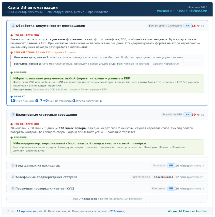 Об этом проекте — две статьи. Эта — про бизнес-задачу, результаты и практическое применение. Вторая, техническая — про архитектуру, стек и процесс разработки на Хабре: Воякс — аналитик ИИ-автоматизации. Читать можно в любом порядке, статьи дополняют друг друга.