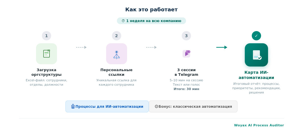 А вот вопросам типа «А что вообще с ним делать?» и «Куда внедрять?» как раз и посвящён наш сервис и эта статья. Знакомьтесь: Воякс — аналитик ИИ-автоматизации (он же Woyax AI Process Auditor).