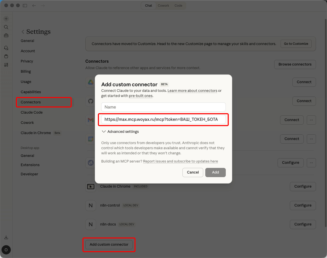 2. RuTube Карта применимости доступна по ссылке: https://woyaxnini.github.io/mcp-max-messenger/ В ссылке для подключения вы указываете токен вашего бота в MAX: https://max.mcp.woyax.ru/mcp?token=ВАШ_ТОКЕН_БОТА Ссылку указываем тут для Claude Desktop: Или тут для Claude в браузере: Тут для ИИ-ноды в n8n: ВСЁ! Работаем и используем, как показано в видео и в нашей карте применимости (https://woyaxnini.github.io/mcp-max-messenger/).