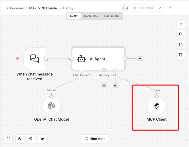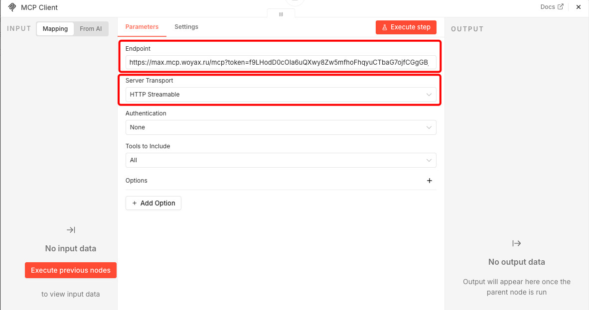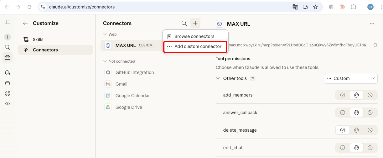 Мы пошли дальше и сделали первый в мире MCP-сервер для MAX от VK — национального мессенджера России с подключением и использованием по URL ссылке. Обладает теми же инструментами и навыками, что и локально устанавливаемая версия, но теперь его можно подключить по одной ссылке, в том числе в браузерной версии LLM (на примере Claude) или в ноде ИИ-агента в n8n.