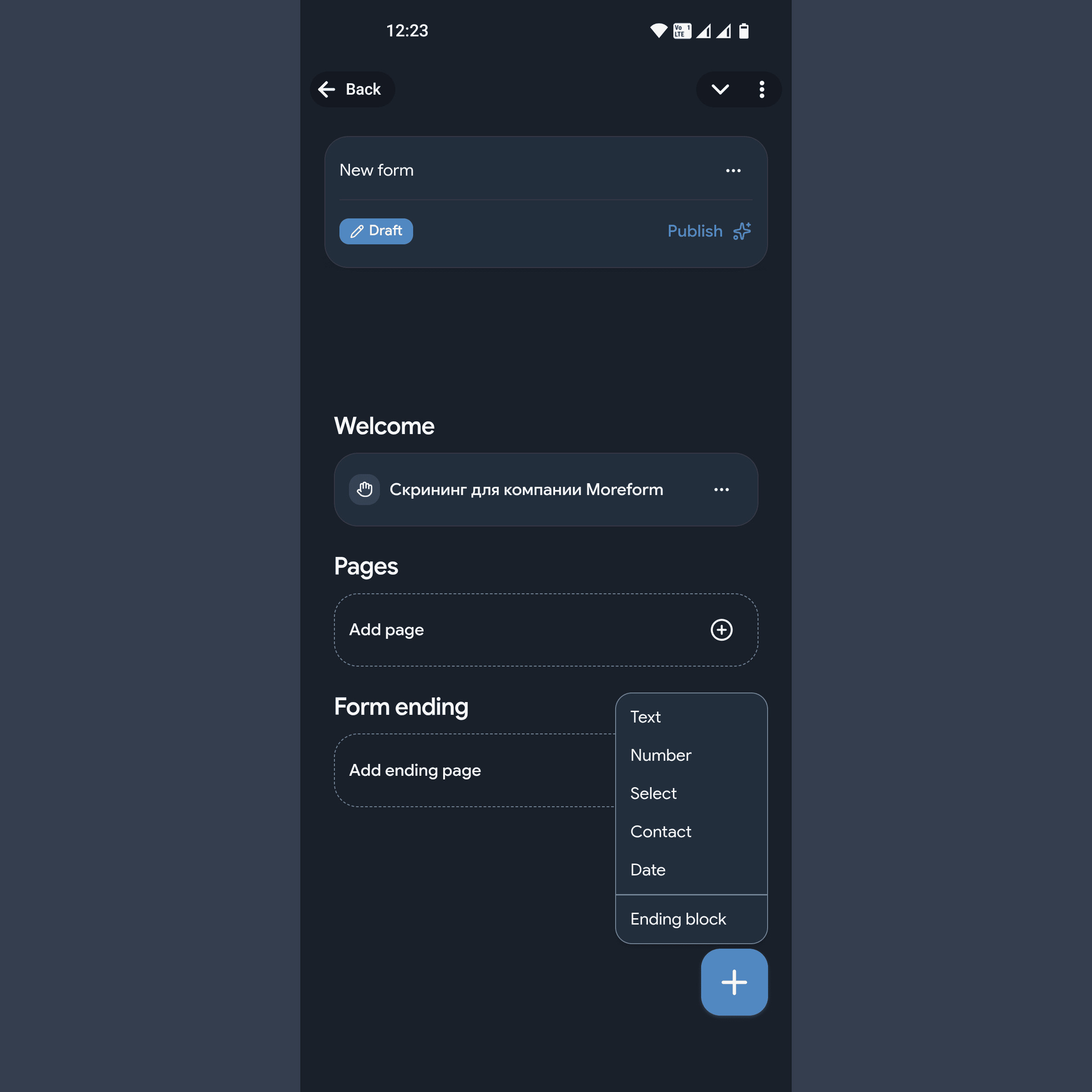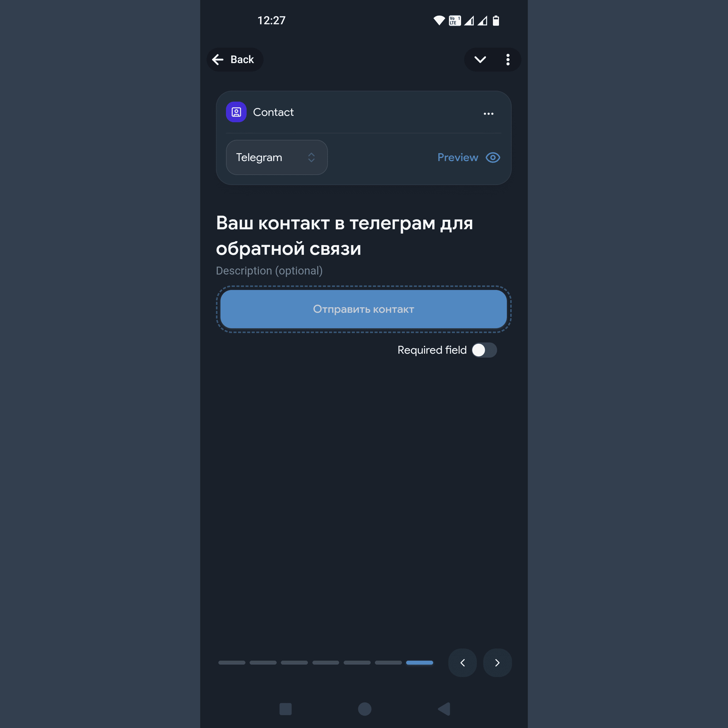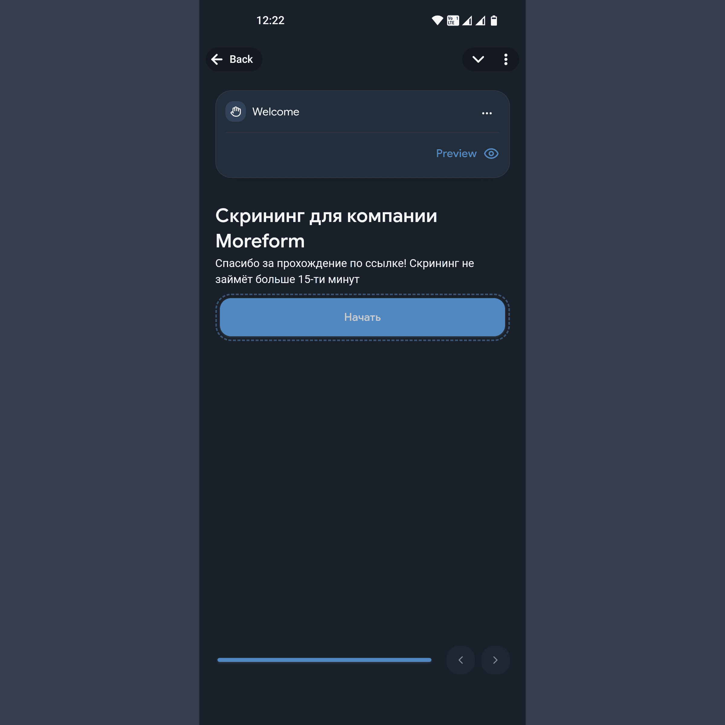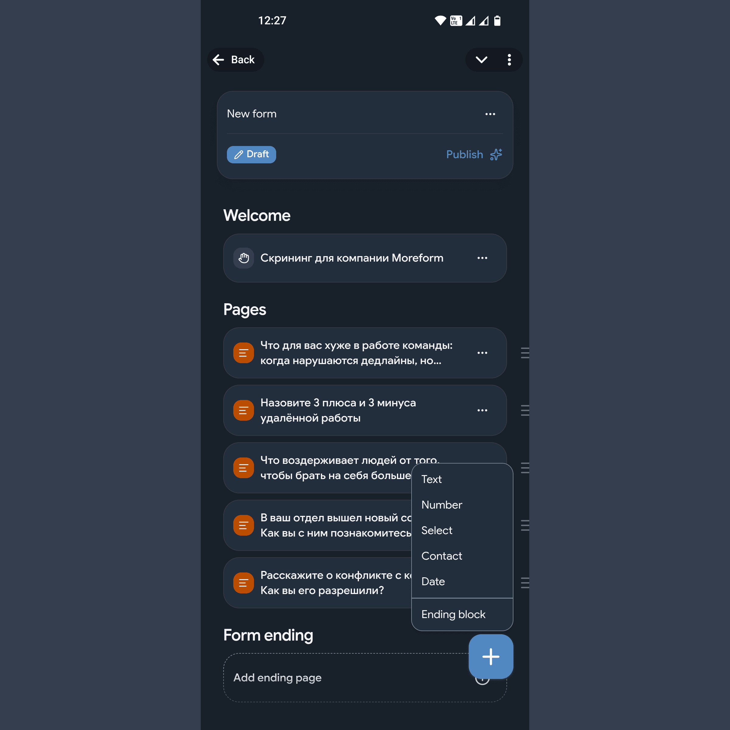 1. Создайте новую форму в боте 2. Измените язык формы на русский — для отображения ситемных сообщений на русском при прохождении формы 3. Добавьте экран приветствия — кратко объясните роль и что будет дальше 4. Для каждого вопроса — отдельная страница, по одному вопросу на экран 5. Запрос Telegram-контакта — автоматически, без ручного ввода 6. Экран завершения — поблагодарите кандидата и обозначьте следующие шаги 7. Опубликуйте форму и поделитесь ссылкой на неё, для прохождения её участниками Результат: вместо 100 вводных звонков вы получаете 10 детальных профилей с ответами на самые важные вопросы о soft skills — и звоните только тем, кто уже прошёл первый фильтр.