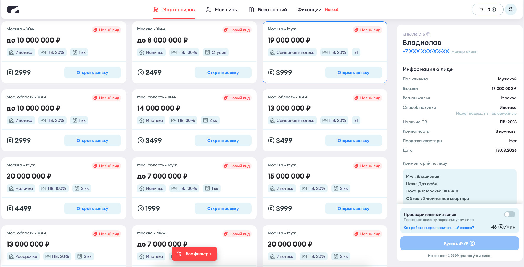 Один из сервисов, работающих по этой модели, — сервис Semantiqo. Платформа устроена как каталог лидов на новостройки: брокер выбирает контакты по нужным параметрам — география, бюджет, тип жилья — и покупает конкретные карточки клиентов.