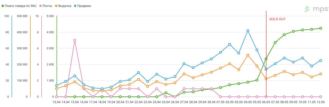 Системная внешка. Не «пара постов у блогеров», а последовательная стратегия продвижения товара на маркетплейсе: тесты каналов, разные подачи, аналитика и корректировки. Именно регулярность создала эффект масштаба, а не отдельные всплески.