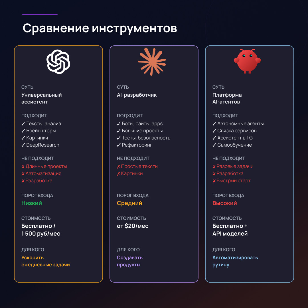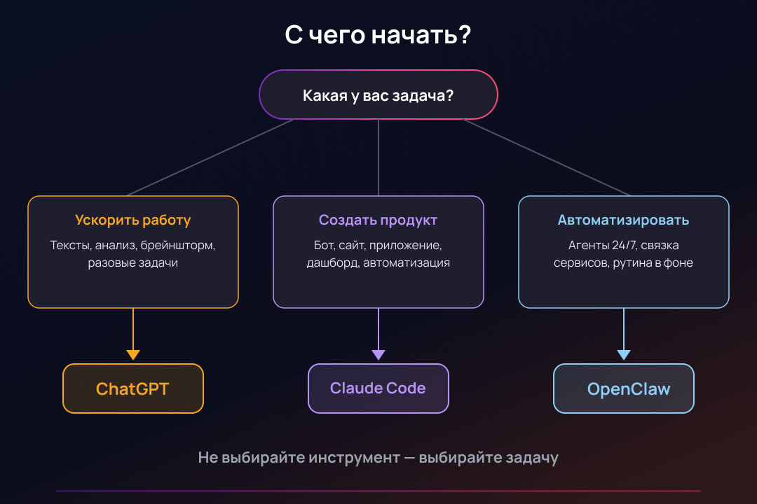 Стоимость: бесплатно (self-hosted) + стоимость API моделей Если вы не программист и хотите просто ускорить работу — начните с ChatGPT. Это самый низкий порог входа. Если хотите создавать продукты (боты, сайты, приложения) — Claude Code. Даже без навыков программирования, через вайбкодинг. Если хотите автоматизировать рутину и выстроить систему агентов — OpenClaw. Но будьте готовы потратить время на настройку. Не выбирайте инструмент — выбирайте задачу. Определите, что конкретно хотите автоматизировать или создать. Инструмент подберется сам. 91% пользователей AI работают с одним основным инструментом. Не с десятью. С одним. Поиск «лучшего» — ловушка. «Достаточно хороший» работает лучше «идеального, которого так и не выбрали». Выберите один инструмент. Решите одну задачу. Получите результат. Потом расширяйте.