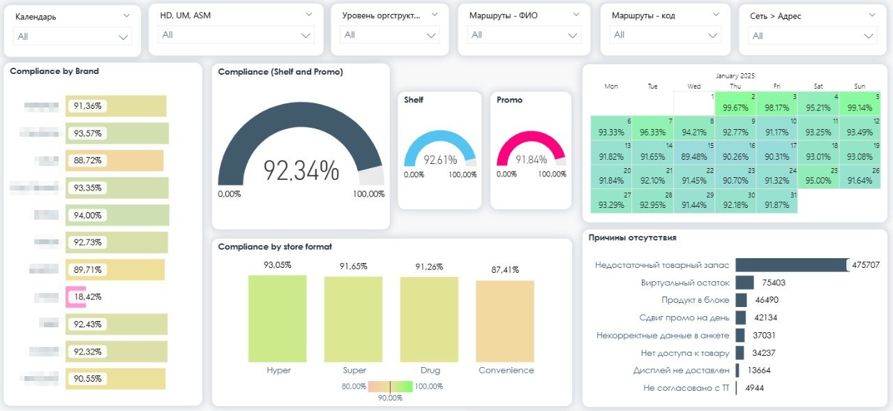 Рабочий отчет для отделов трейд-маркетинга, продаж и полевой команды. Отчет, где видно, выполняют ли мерчандайзеры план визитов, есть ли товар на полке, как мы выглядим относительно конкурентов, прайс-мониторинг, анализ рабочего времени сотрудников — инструмент, на который бизнес реально опирается при принятии решений. Источником выступает PostgreSQL, которую наполняет вендор.