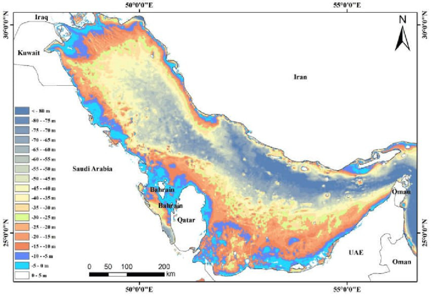 Вот, к примеру, карта глубин Персидского залива. Максимум — 93 метра. Для сравнения: в соседнем Оманском заливе — до 3700. А у побережья Эмиратов — мелководье, которое тянется километрами. Это не море, это плоский аквариум, в котором удобно насыпать что угодно и куда угодно.