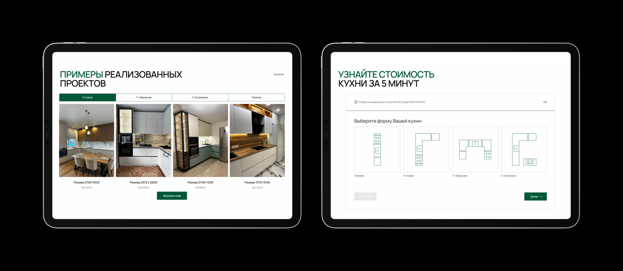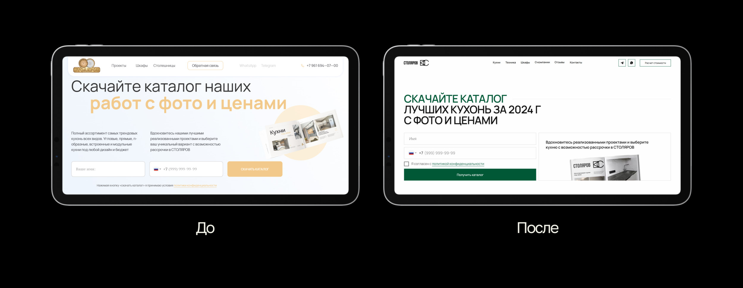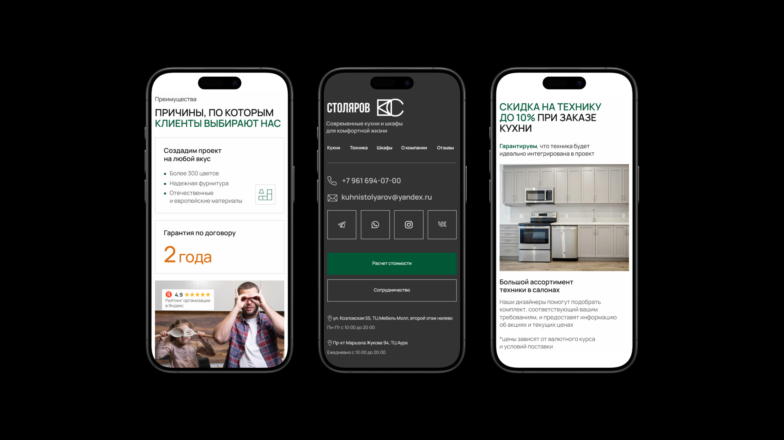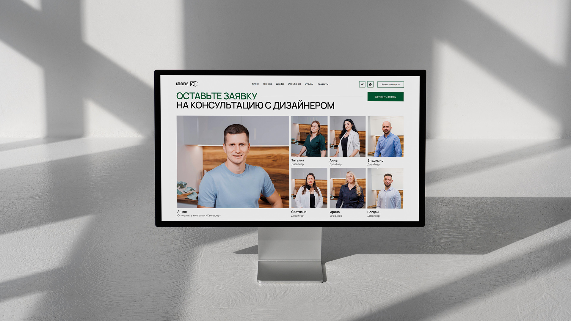 Как только стало понятно, что сайт выполнил свою цель: начал получать целевые заявки и помог компании планомерно расти в рунете, мы завершили свою работу и полностью передали проект Роману во имя дальнейшей лидогенерации и конверсии. Спустя 2 года Антон вернулся с новым запросом: обновить сайт так, чтобы он перестал быть только рекламным инструментом. Основная цель — вывести компанию на новый уровень и повысить её ценность в глазах клиентов, а значит, нас ждали изменения в позиционировании и улучшение работающих решений. Первый экран — это те секунды, когда пользователь принимает решение: остаться или уйти. Поэтому если и начинать изменения, то с самого начала. Антон за годы ведения бизнеса успел досконально изучить преимущества своей компании и поэтому желание показать все достоинства, все уникальные предложения возникло сразу. Ему хотелось передать свою любовь к делу и показать команду единомышленников — специалистов, которые с таким же энтузиазмом помогают людям создавать уют в их домах и отвечают за качество. Мы предложили сделать слайдер на главной странице, где одно преимущество сменяет другое, а лица клиентов говорят о положительном опыте. На бумаге всё выглядело отлично (или в фигме). Но как только мы перешли к реальной разработке, выяснилось, что всё не так просто в техническом плане реализации. Мы стремились к нестандартному слайдеру, но в процессе начали сталкиваться со множеством технических проблем. То шрифт «прыгает», то страница долго загружается, и это точно не подходит для сайта, который должен быть быстрым и удобным. Перепробовали разные модификации и, наконец, нашли вариант, который идеально подошёл по визуальному критерию и скорости загрузки. Ещё на этапе прототипа мы решили немного упростить структуру сайта. На старом сайте преимущества были в нескольких местах: один блок расположен в начале, другой — в середине, третий — ближе к концу. Мы объединили их в один, сократили текст и оставили только самое важное. Контакты тоже привели в порядок: раньше они встречались в нескольких местах, а теперь собраны в футере. А ещё добавили блок про технику, чтобы стимулировать доп.продажи: теперь клиент при заказе кухни может сразу подобрать к ней варочную панель, духовой шкаф и вытяжку. Это удобно, экономит время и повышает доверие к компании: когда всё в одном месте, решение принимать проще. Самым важным моментом было доверие. Мы хотели показать, что за этим бизнесом стоят неравнодушные люди, поэтому уделили особое внимание команде. На главной странице разместили фотографии дизайнеров, чтобы пользователи могли увидеть тех, кто создает их будущий интерьер или ведёт консультации. Кухни, конечно же, были и остаются флагманским продуктом компании, поэтому главную страницу полностью посвятили им, а вот страница о шкафах стала внутренней. Визуально страницы выглядят идентично, пользователю комфортно в знакомом визуале и поэтому фокус направлен на выбор товаров. Когда мы начали работать над редизайном, было понятно, что сайт должен выглядеть современно, без лишней перегруженности. Поэтому мы сделали его более воздушным и чистым: отрисовали минималистичные иконки, отказались от серых теней у элементов и выбрали более современный вид вёрстки — автоскейл. Геометрия тоже говорит о сути проекта. Вместо скруглений остан