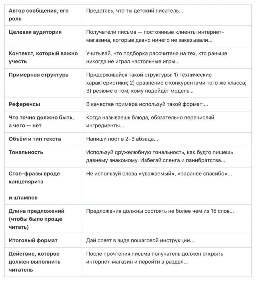 К сожалению, единого правила по составлению промпта нет, всё зависит от конкретного случая. Например, в тех же текстовых задачах свои универсальные детальки, из которых может состоять хороший запрос. В целом их можно переложить на околотематические специальности вроде маркетинга, аналитики и дизайна, но придётся немного поколдовать.