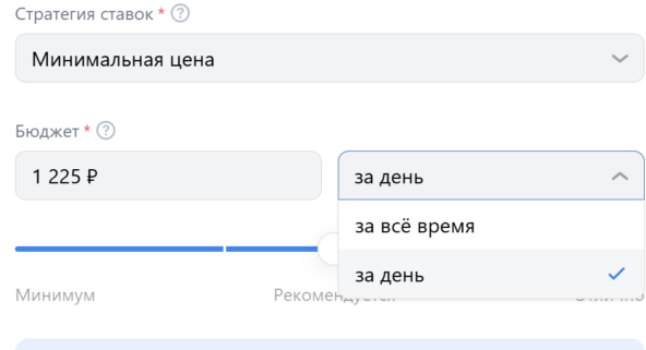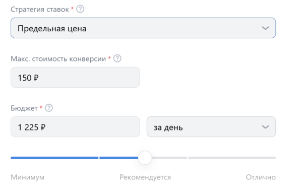 Рекомендуется запускать первые тесты, чтобы определить стоимость конверсии. Лучше устанавливать 2-3 средних стоимости конверсии на дневной бюджет, чтобы алгоритмы показывали рекламу более качественной аудитории. Предельная цена:
