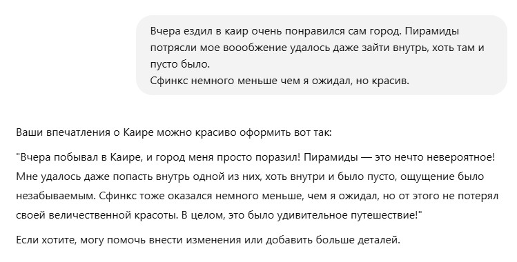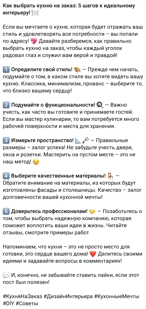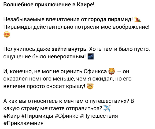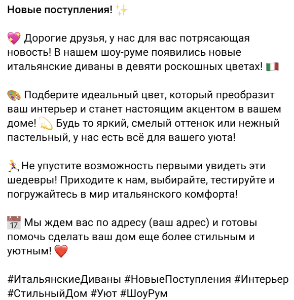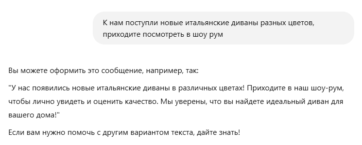 Вчера ездил в каир очень понравился сам город. Пирамиды потрясли мое воображение удалось даже зайти внутрь, хоть там и пусто было. Сфинкс немного меньше чем я ожидал, но красив.» Коротко и лаконично, чуть подправить и ChatPost сделал почти идеальный текст Попробую еще один запрос «К нам поступили новые итальянские диваны разных цветов, приходите посмотреть в шоу рум» Оба справились, но мне нравится текст ChatPost бота, что в нем есть сразу эмодзии и хештеги «Как выбрать кухню на заказ» Тут