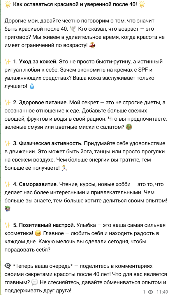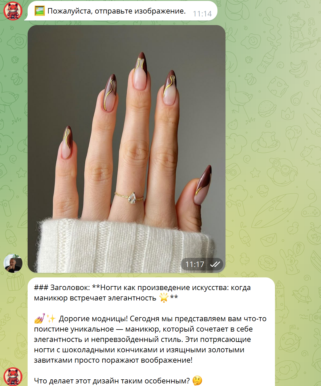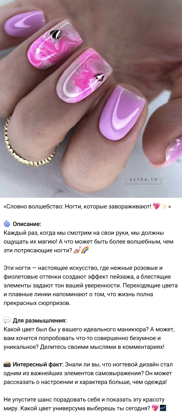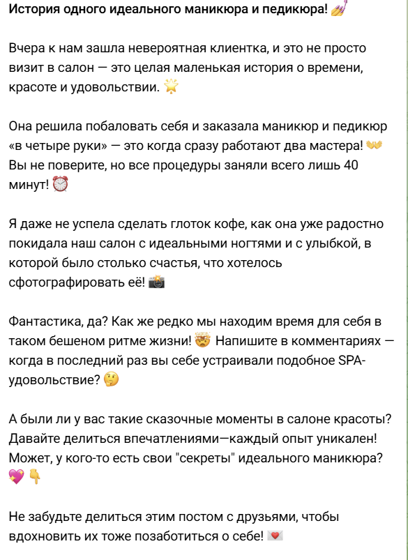 ✅ Делает посты по фото — отправляете фото маникюра, бровей, укладки, макияжа или процесса в работе, а бот сам напишет к нему интересный текст: заголовок, описание, call to action. ✅ Генерирует готовые контент-планы — хотите план на неделю для Instagram или VK? Просто попросите, и получите список тем. ✅ Пишет сценарии для Reels, Shorts и TikTok — прямо в боте можно задать тему, и он предложит разбор по кадрам, идею для видео и даже варианты текста для озвучки или субтитров. Вы сделали фото свежего маникюра и не знаете, как описать? Просто кидаете фото боту — и через пару секунд получаете пост: «Золотые акценты и игра контрастов — этот маникюр вдохновлён классикой и современностью. Подчеркнёт ваш стиль и настроение в любой день!» Или, допустим, вы хотите сделать пост на тему «Как оставаться красивой после 40 лет», но не знаете как начать. Надиктовали это боту голосом — и уже через минуту он выдаст вам структурированный текст с советами и интересной подачей. Можно даже загружать небольшие истории из салона — бот превращает их в контент. Пример:"К нам вчера пришла клиентка, заказала маникюр и педикюр в 4 руки — справились за 40 минут, клиентка в восторге!" Бот за секунды превращает это в готовый пост в формате истории, которую можно сразу публиковать в соцсети. Допустим, у вас накопилось 20–30 фото маникюров, причесок, укладок. Обычно это превращается в долгую работу по написанию 20-30 постов. Но с ботом — просто загружаете их по очереди, и через несколько минут у вас готова лента для Instagram или VK. Точно так же работает и с видео: надоело придумывать темы для Reels? Бот генерирует сценарии, разбивает их по шагам и предлагает идеи для визуала и текста. А самое приятное — у бота есть бесплатная версия, которой хватит большинству мастеров и салонов для ежедневной работы. Сфера красоты — одна из самых контентных. Здесь важен визуал, эмоции, интересный текст и постоянный поток новых публикаций. Но у мастеров часто нет ресурсов и времени превращать фотоконтент в полноценные посты. С помощью бота можно: Если вы: ведете соцсети для салона, работаете мастером, создаете бьюти-контент для клиентов или личного бренда,...вам реально стоит попробовать этот бот. Он не заменит вашего стиля и креатива, но возьмет на себя рутину и будет вашим помощником в контенте. Есть бесплатный период и все удобно и прямо в Telegram