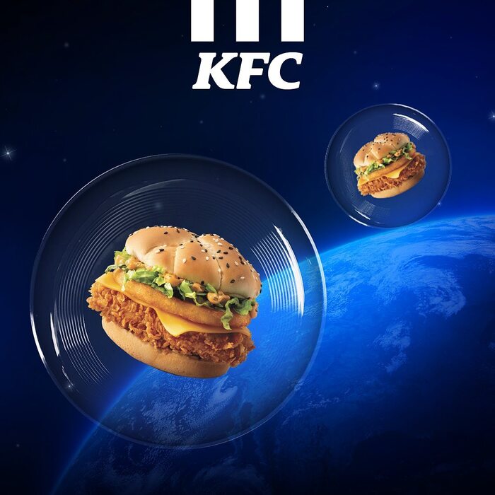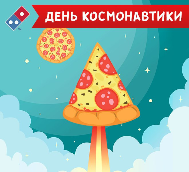 космонавтики. Рассмотрим несколько примеров, как космос продаёт. А KFC в соцсетях поздравляла всех с праздником оригинальным постером, где бургеры изображены парящими в космосе, словно