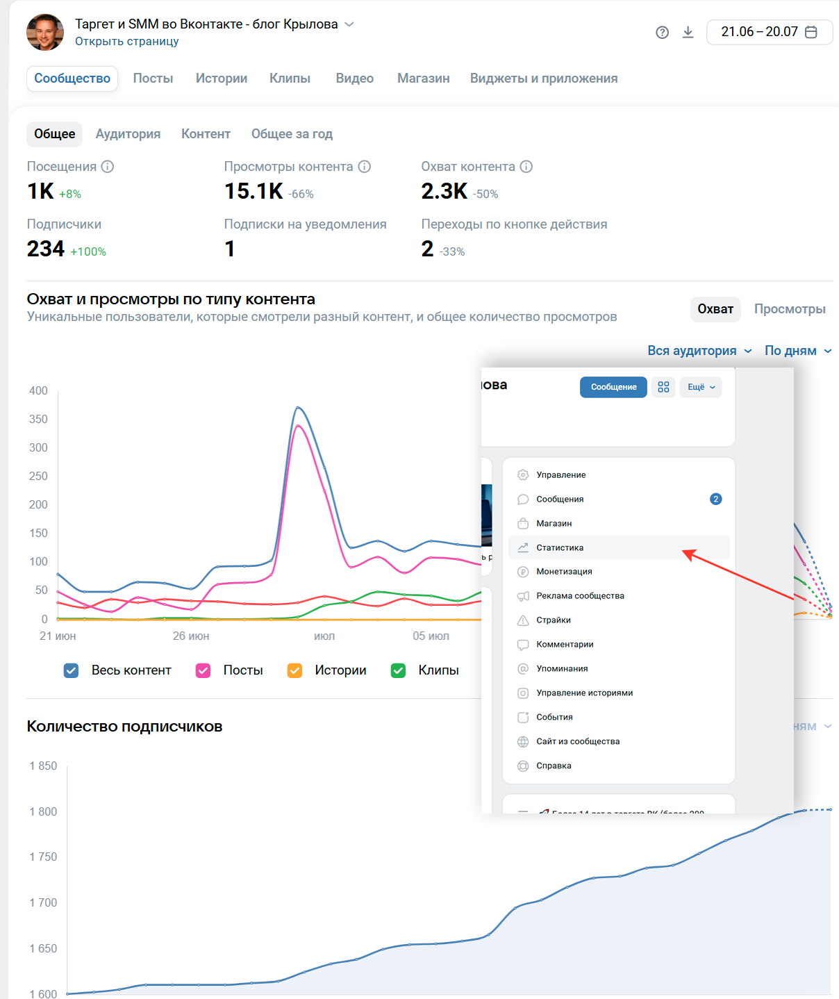 сообщества ВК позволяет прямо на странице увидеть базовые цифры: просмотры, лайки, комментарии, репосты, прирост подписчиков. Анализируйте эти данные и экспериментируйте. Если видите, что прирост остановился — попробуйте новый тип контента или запустите рекламу. Если растёт — продолжайте в том же духе. Также статистика пригодится, когда будете обосновывать успех сообщества (для себя или для рекламодателей). Подведём
