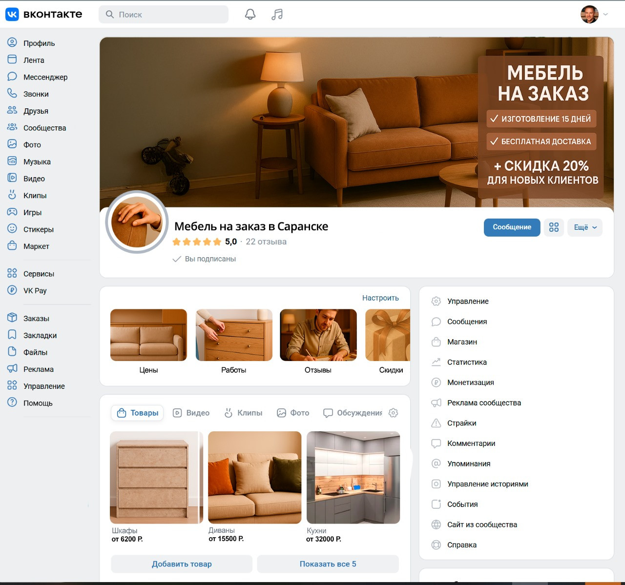 Я взял этот проект, потому что мебель — очень конкурентная ниша. И кейс показал, что даже в небольшом городе вроде Саранска можно находить клиентов через ВКонтакте.